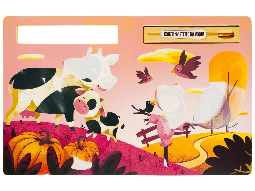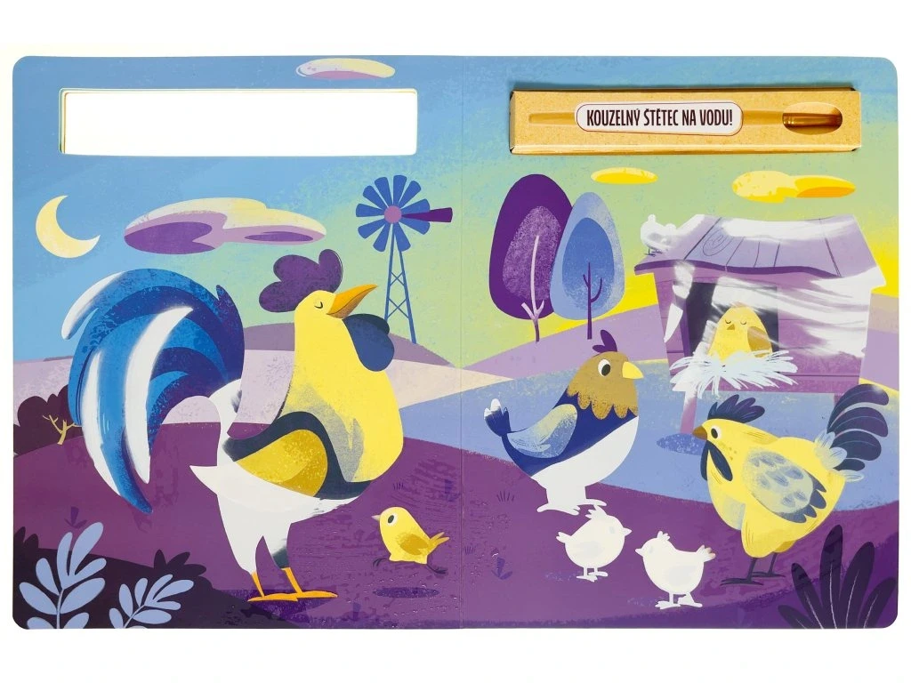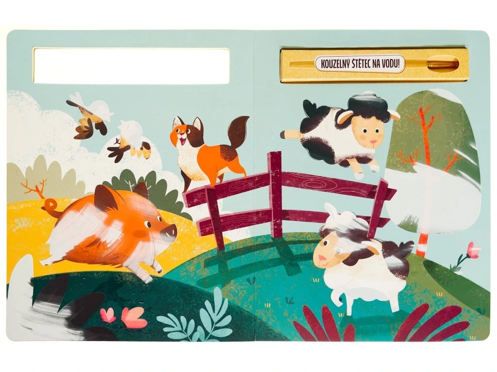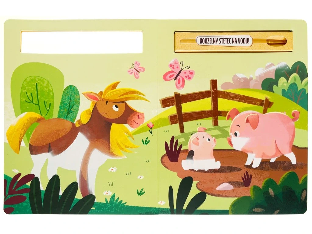 Pretri štetcom biele miesta v tejto knihe určenej na maľovanie vodou. Obrázky zvierat z farmy sa ako kúzlom objavia a až uschnú, farby zase zmiznú.