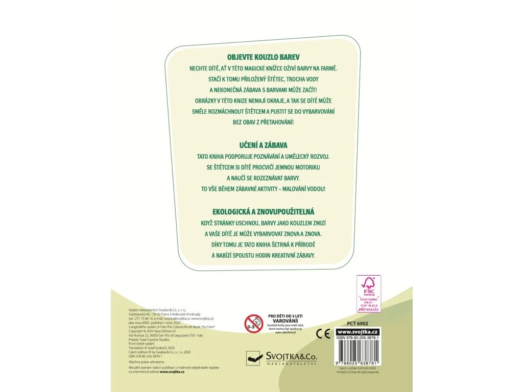 Nechajte dieťa, nech oživia farby v tejto knihe so zvieratami z farmy. Stačí na to priložený štetec, trocha vody a nekonečná zábava s farbami môže začať! Keď stránky uschnú, farby ako kúzlom zmiznú a vaše dieťa ich môže vyfarbovať znova a znova. Obrázky v tejto knihe nemajú okraje, a tak sa dieťa môže smelo rozmáchnuť štetcom a pustiť sa do vyfarbovania bez obáv z preťahovania. So štetcom si dieťa precvičí jemnú motoriku a naučí sa rozoznávať farby. To všetko počas zábavnej aktivity - maľovanie vodou!