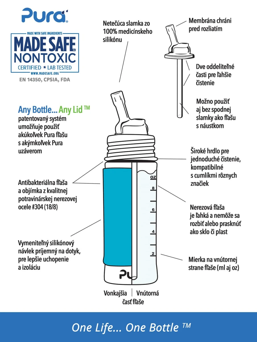 Bezpečná fľaša vyrobená 100% bez plastových častí. S Pura fľašami si môžete byť istí, že sa do nápoja vo vnútri neuvoľňujú žiadne škodlivé látky a toxíny, ani príchute a pachy ako je tomu u plastových fliaš alebo fliaš s plastovými viečkami. Pura fľaše sa navyše prispôsobujú a „rastú“ s Vaším dieťaťom. Jednoduchou výmenou uzáverov sa fľaša mení z dojčenskej fľaše na fľašu s náustkom, slamkou alebo športovým uzáverom či na pohár na príkrmy a občerstvenie. Môžete tak jednu fľašu používať mnoho rokov. One Life… One BottleTM.
