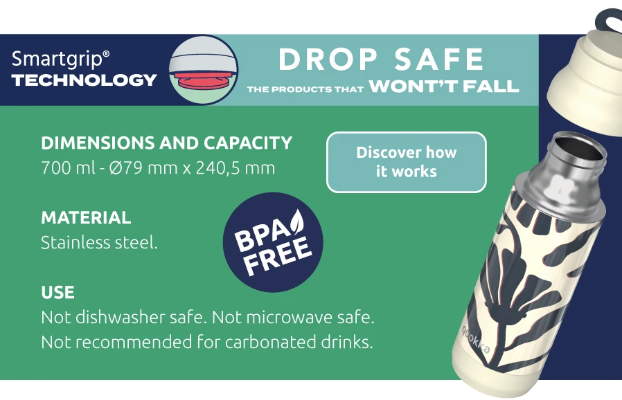 Quokka Pulse je súčasťou kolekcie fliaš a hrnčekov Drop Safe so špeciálnym dnom Smartgrip®, ktoré pri postavení na hladký povrch bránia prevrhnutiu a nechcenému vyliatiu obsahu fľaše.