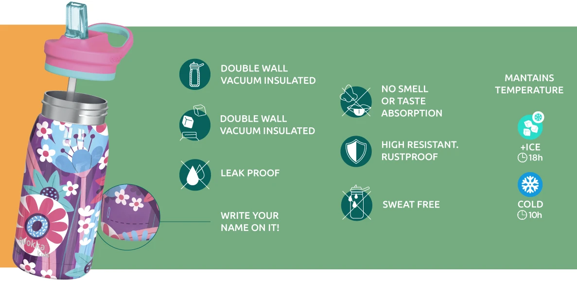 Detská termofľaša Quokka Pop Kids z vysoko kvalitnej dvojstennej ocele udrží nápoj aj počas horúcich letných dní príjemne studený