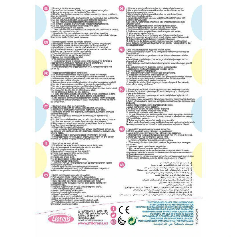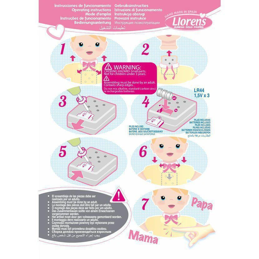 K bábätku je možné dokúpiť ďalšie originálne oblečenie z ponuky Llorens pre bábätká NEW BORN veľkosti 40-42 cm alebo 43-45 cm. Súčasťou balenia je 3 x gombíková batéria LR44 s návodom na jej výmenu. Batérie sú spotrebný tovar a preto ich vybitie nie je dôvodom na reklamáciu bábiky.