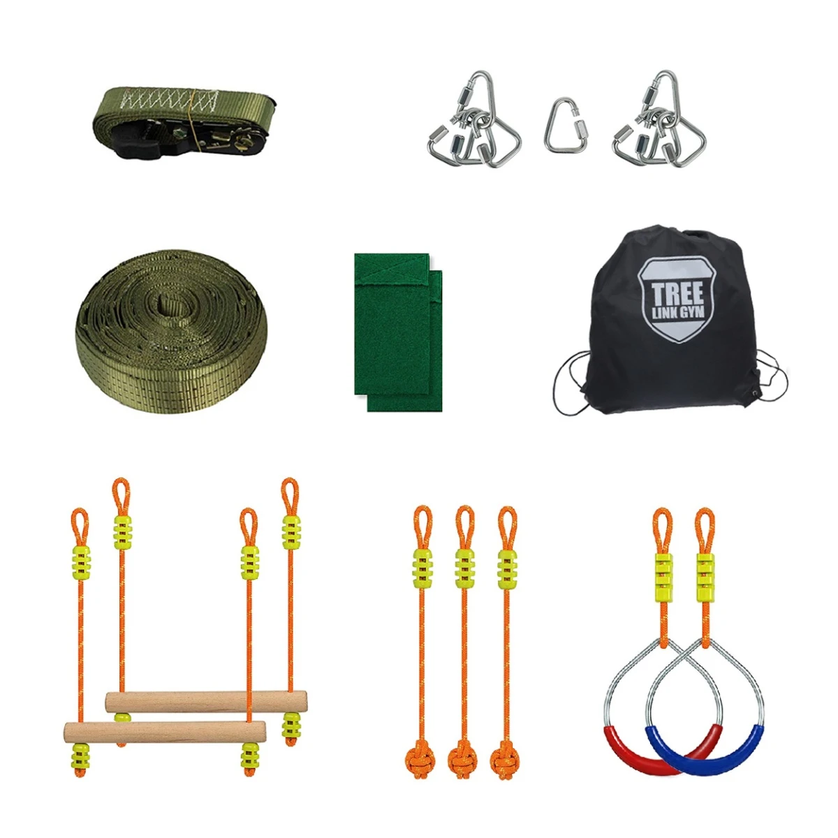 Súčasťou balenia sú: taška, pás s 9 úchytmi a 9 karabínami na uchytenie prekážok, 1 upínací pás s račňou, 2 chrániče stromov, 2 prekážkové hrazdičky, 2 prekážkové kruhy a 3 prekážkové lanové úchyty