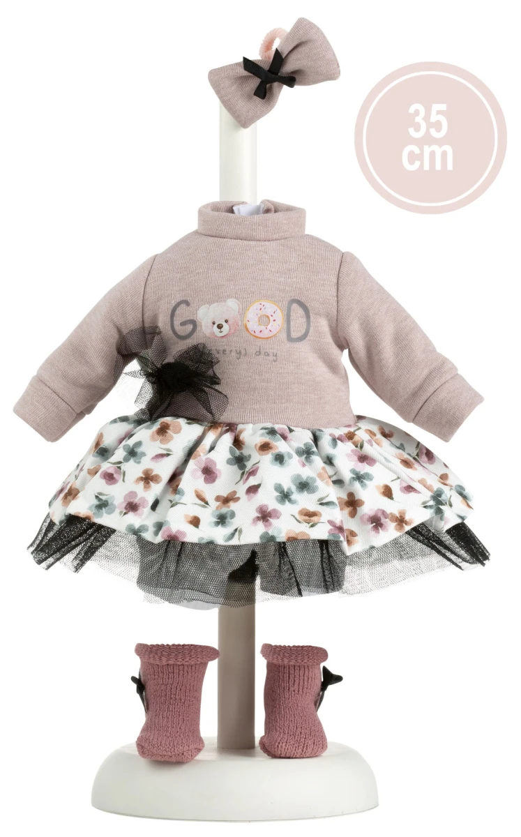 Tento 4dielny set oblečenia pre bábiku Llorens veľkosti 35 cm obsahuje 3 kusy oblečenia a ozdobnú gumičku s mašľou do vláskov, ktorá doladí celý outfit.