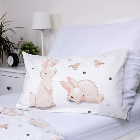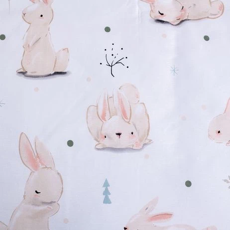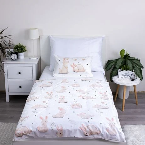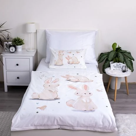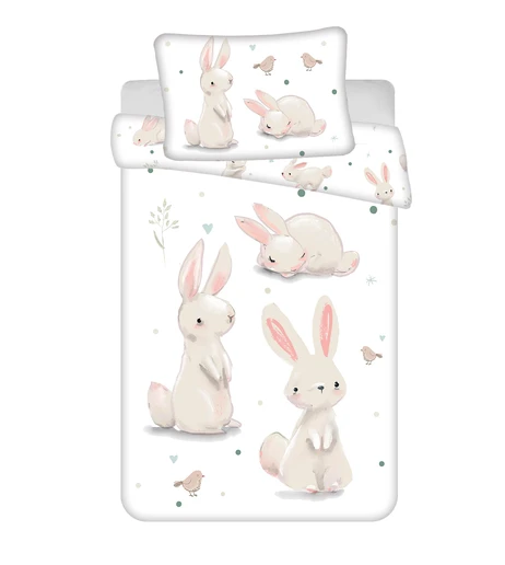 Posteľná súprava s králikmi je určená pre menšiu detskú postieľku a vďaka jemnému motívu vytvorí v detskej izbičke príjemnú a pokojnú atmosféru.