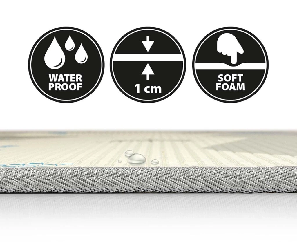 Kreatívne a farebné vzory podložky povzbudzujú aktivitu, najmä v raných fázach vývoja. Plochý povrch penovej podložky umožňuje vášmu dieťaťu modelovať stabilný trup, prirodzene a voľne otáčať hlavou, precvičovať rotácie, opierať sa, správne zaťažovať nohy a stabilne a bezpečne sedieť. Rolovacia penová podložka KINDER je bezpečným a pohodlným miestom na hranie. Produkt poskytuje vynikajúcu izoláciu od studených podláh a vďaka nepremokavému povrchu sa ľahko čistí a je ideálnym doplnkom do každej izby. Jeho vysoká flexibilita zaisťuje vynikajúce tlmenie nárazov v prípade pádu. Možno ho použiť aj vonku na hladkom povrchu. Naša podložka je taktiež ideálna na cesty.
