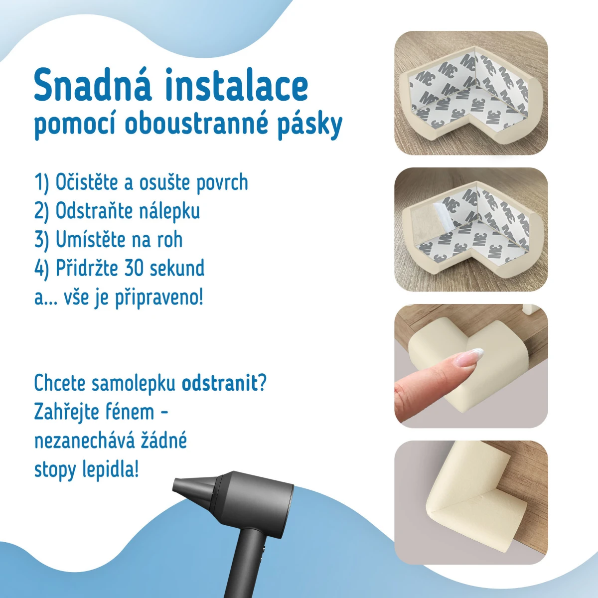 3. Pred použitím nechajte pásku dobre priľnúť k povrchu nábytku - približne 24 hodín.
