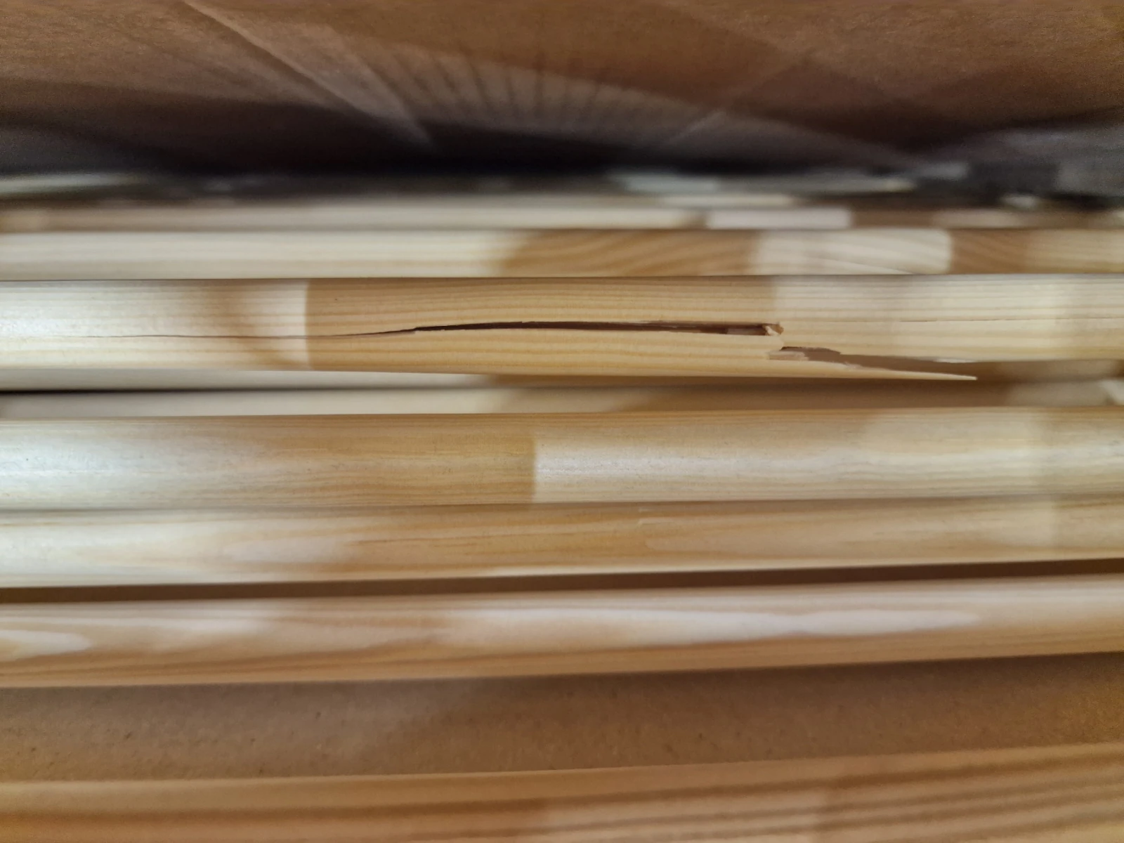 Ohrádka je nová, nepoužívaná, zaradená do 2. akosti z dôvodu poškodenia jednej šprušle. Tá je prasknutá (pozri fotografie), čo môže vytvárať ostré hrany a predstavovať riziko poranenia dieťaťa. Pred použitím je preto nutná oprava.