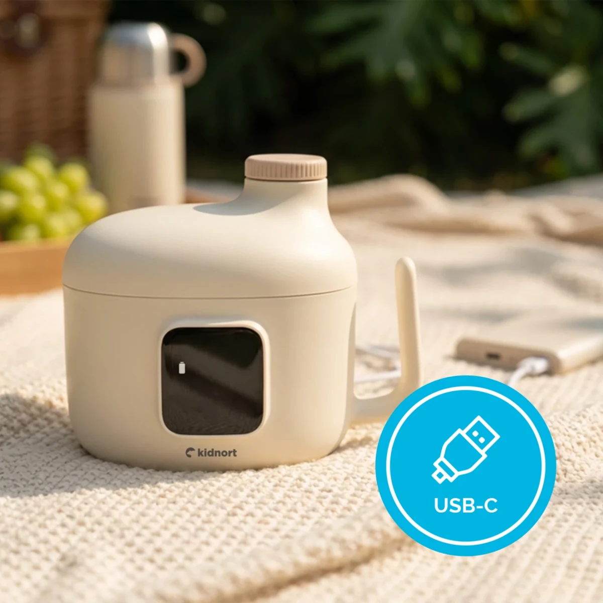 Napájanie cez USB-C umožňuje nabíjanie z powerbanky, auta alebo zásuvky. Dotykový displej a jednoduché ovládanie umožňujú manipuláciu jednou rukou. Produkt sa skvele hodí do domácnosti, na prechádzky aj na cesty.
