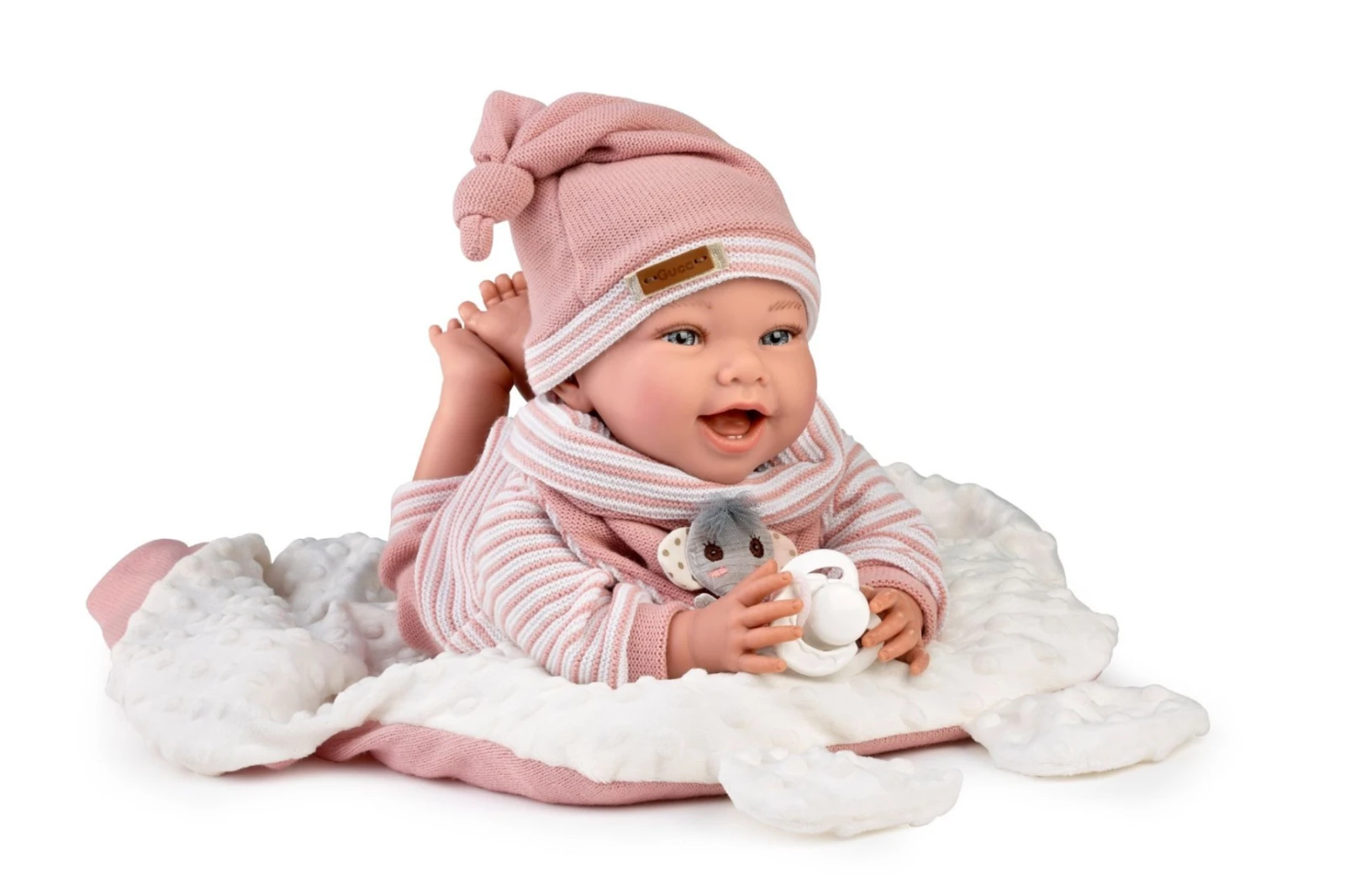 Ručne vyrobená bábika s mäkkým látkovým telom. Veľkosť 42 cm, materiál: vinyl, bavlna. Záťažová výplň bábiky: látkové vrecká plnené kremičitým pieskom. Vyrobené v Španielsku. Odporúčaný vek od 3 rokov.