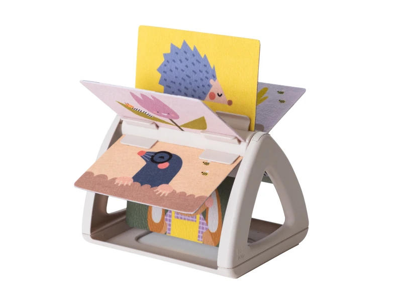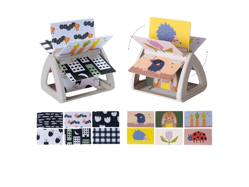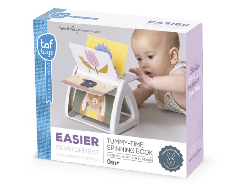 - Od 3 mesiacov: výrazné farebné obrázky a chrastiaci zvuk pri otáčaní jednotlivých stránok upútajú pozornosť dieťaťa pri hre na brušku