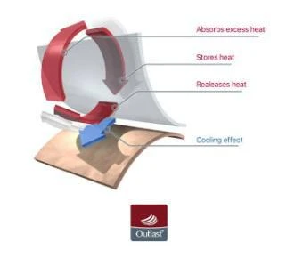 Tento materiál je vďaka svojim termoregulačným schopnostiam veľmi príjemný pri nosení. Pri nadmernom zahriatí tela dokáže Outlast® nadbytočné teplo odviesť a uložiť. V okamihu zníženia teploty ho opäť použije a zahreje. Dieťa tak má zaistený teplotný komfort po celú dobu nosenia.
