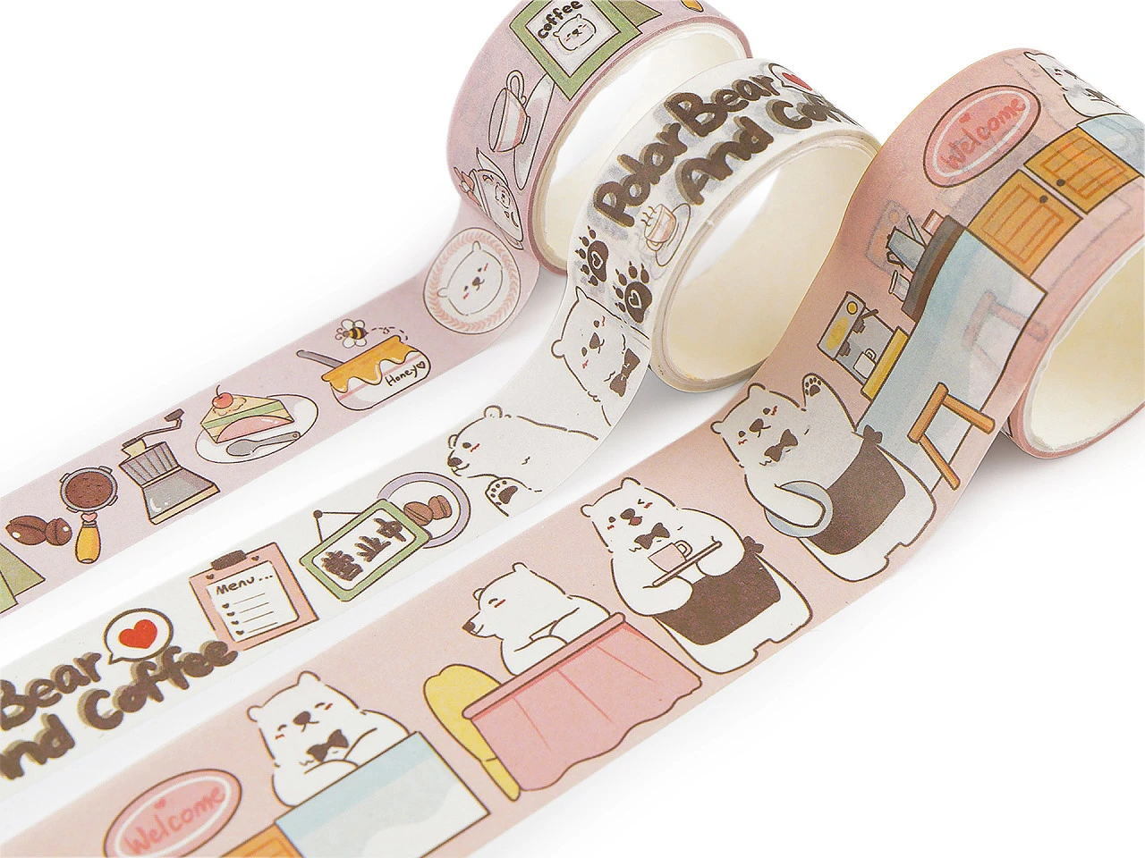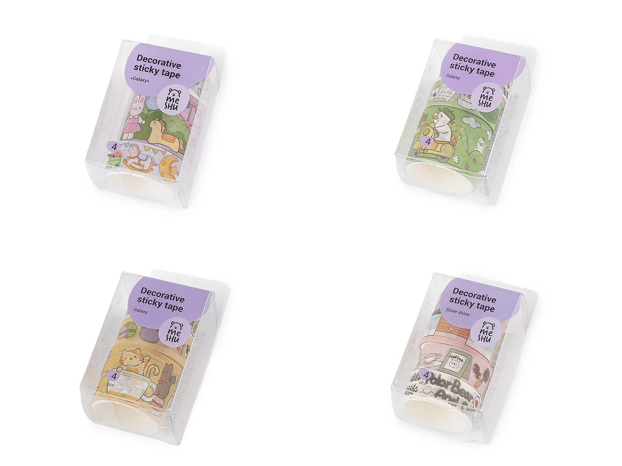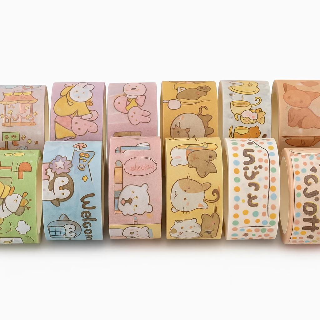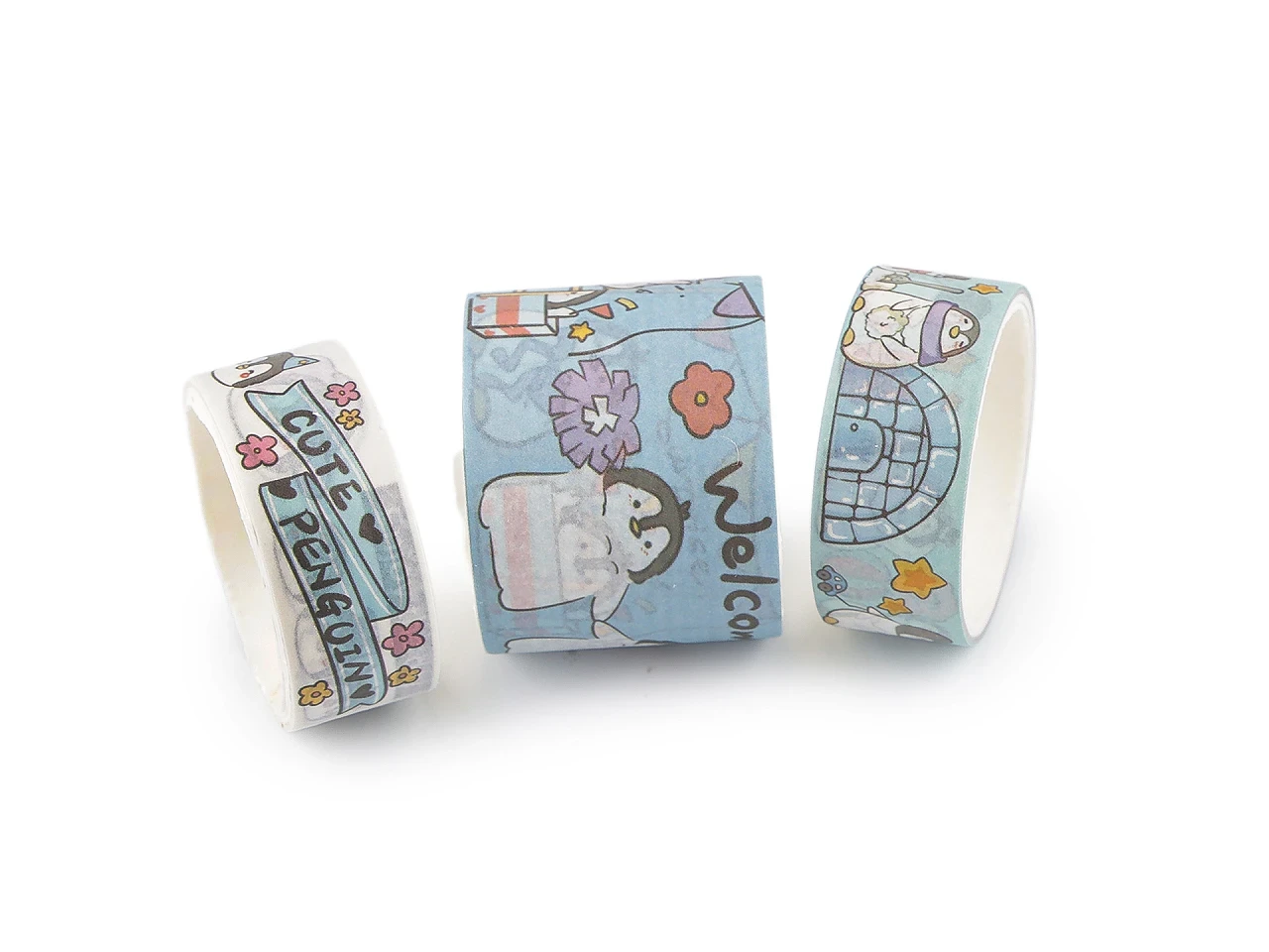 Sada farebných washi lepiacich pások, ktoré môžete lepiť na hladké povrchy ako je drevo, plast, papier, sklo, atď. je ozdobená detskými motívmi.