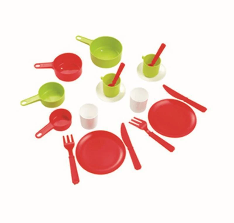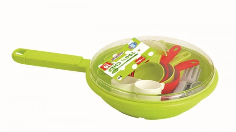 Panvička s pokrievkou a sadou riadu obsahuje taniere, príbory, hrnčeky, lyžičky a ďalšie. Vyrobené vo Francúzsku. Materiál plast. Priemer panvičky cca 20 cm.