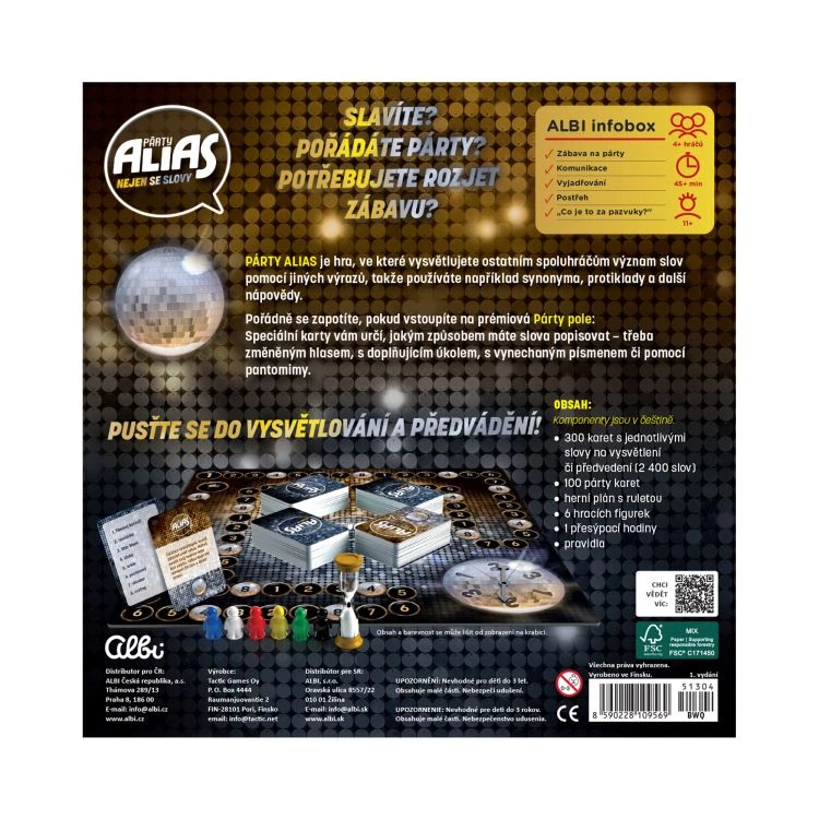 Hra ponúka 400 kariet so slovami a osobnosťami (celkom 2400 slov a 700 postáv), takže zábava len tak nekončí. Vďaka novej českej verzii s aktualizovanými úlohami a moderným vzhľadom sa Párty Alias stane stredom každej spoločenskej akcie.