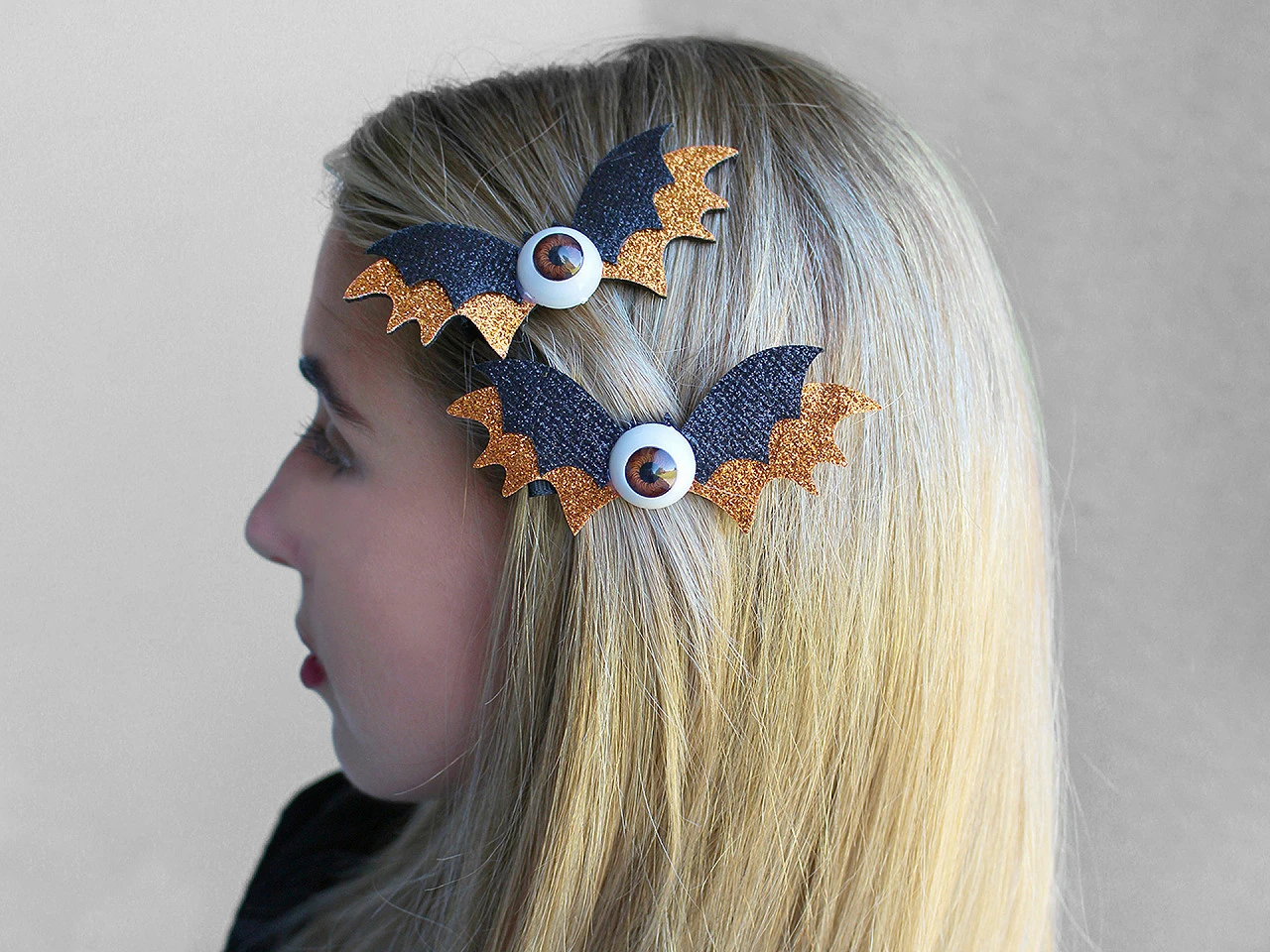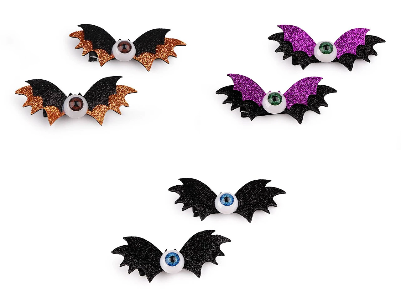 Sú ozdobené plastovým okom a netopierími krídielkami s glitrami. Spony majú drobné zúbky, v účese dobre držia. Nemusí sa nosiť len vo vlasoch, môžete si ich ozdobne pripnúť na tašku, golier košele, kravatu, využijete ich aj ako tematickú dekoráciu.