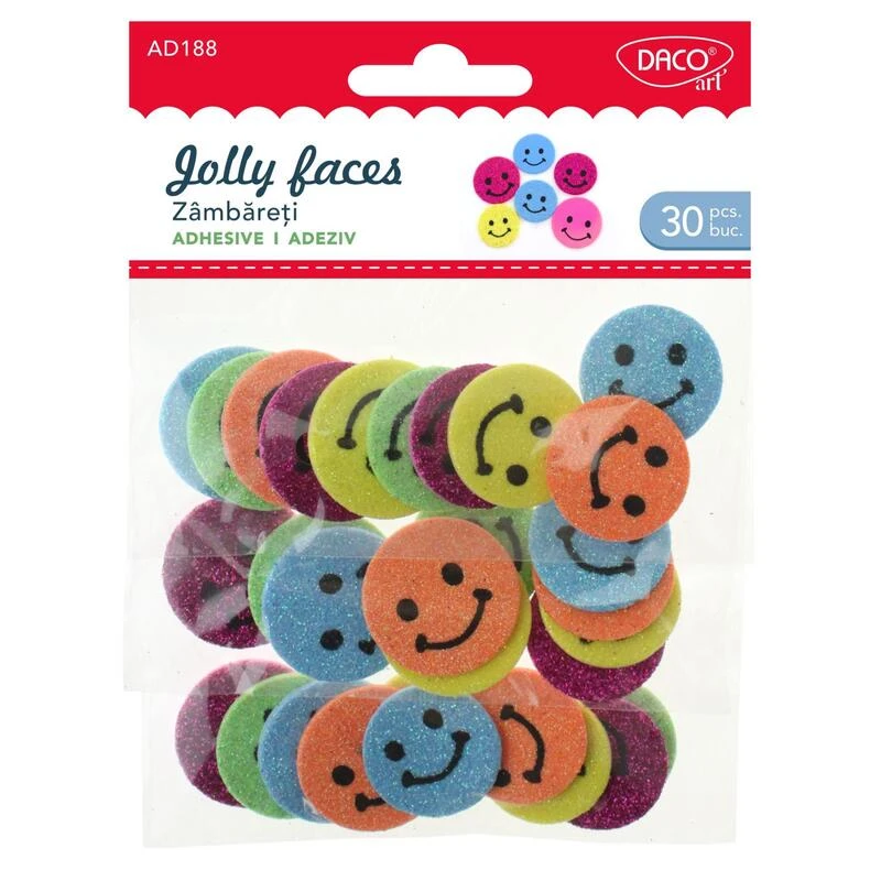 Sada obsahuje 30 penových samolepiek v dvoch veľkostiach a piatich žiarivých farbách. Vďaka trblietavému povrchu dodajú každý výtvoru radostný a lesklý efekt. Sú ideálne na zdobenie zošitov, prianí, darčekov alebo rôznych výtvarných projektov.