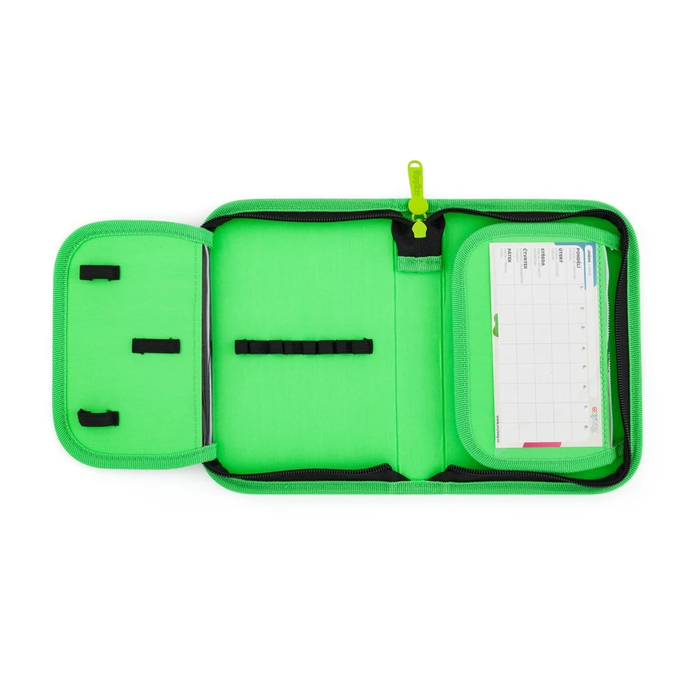 Jednoposchodový školský peračník s 2 chlopňami, prázdny obsahuje 25 gumových pútok na uchytenie písacích potrieb. Na vnútorných chlopniach sú priehľadné fólie na rozvrh hodín.