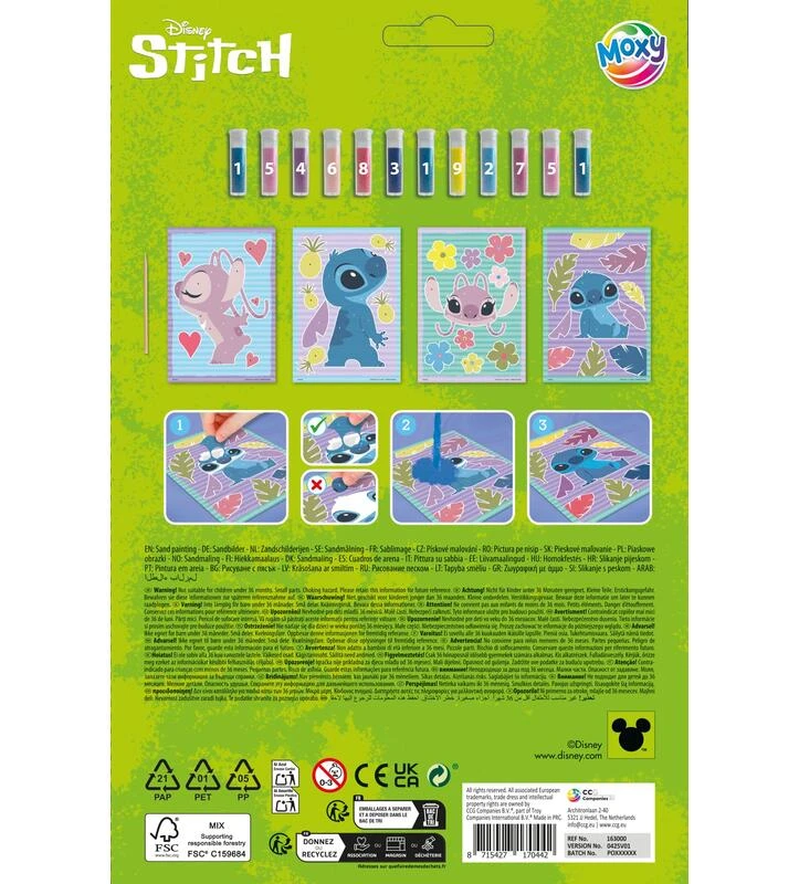 Stitch Pieskovanie obrázkovObsahuje: 4 obrázky na vypískovanie 12 ks tubičiek s pieskom.UPOZORNENIE: Nevhodné pre deti do 3 rokov. Nebezpečenstvo vdýchnutia. Obsahuje malé časti.