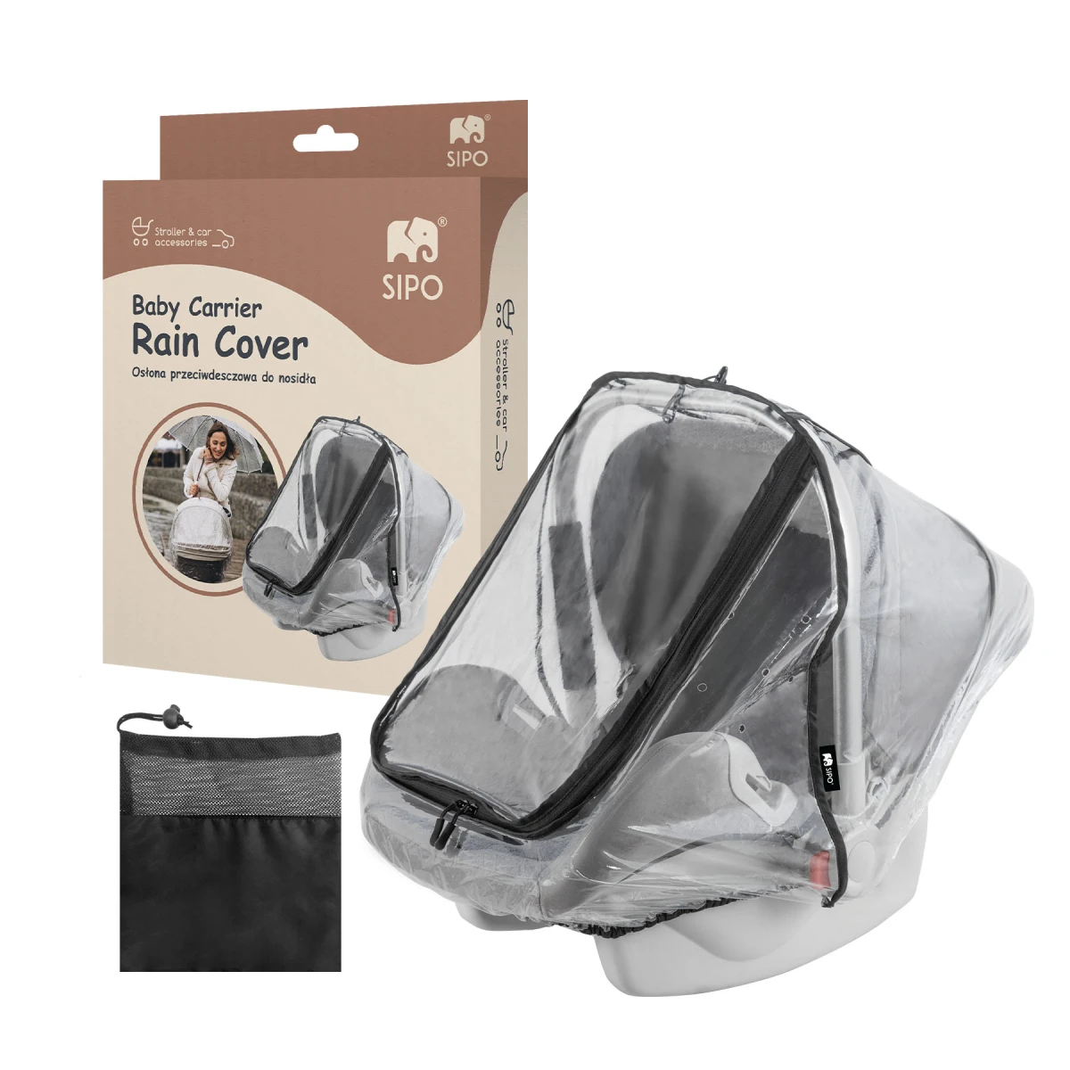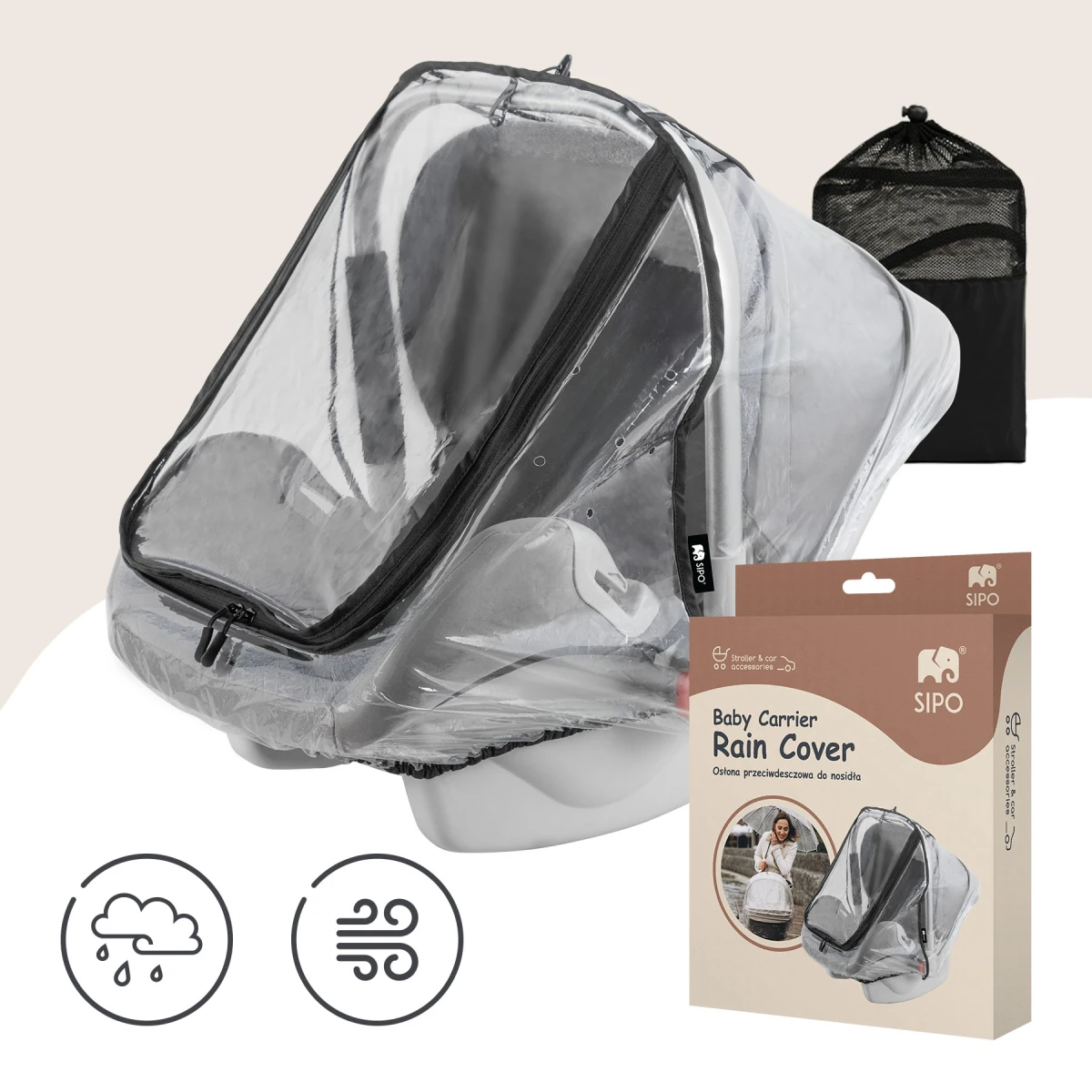Pláštenka SIPO je navrhnutá tak, aby poskytovala úplnú ochranu dieťaťu prepravovanému v nosiči alebo autosedačke. Je vyrobená z vysoko kvalitného materiálu EVA - bez PVC, bez zápachu, známeho svojou pružnosťou, odolnosťou proti ohybu, vlhkosti a nízkym teplotám - vďaka čomu je bezpečná a odolná. Priehľadný materiál zaisťuje neustály vizuálny kontakt s dieťaťom bez toho, aby bránila výhľadu. Vďaka rozmerom (120 × 90 cm) a elastickému pásiku sa pláštenka ľahko prispôsobí väčšine modelov autosedačiek (vajíčok).