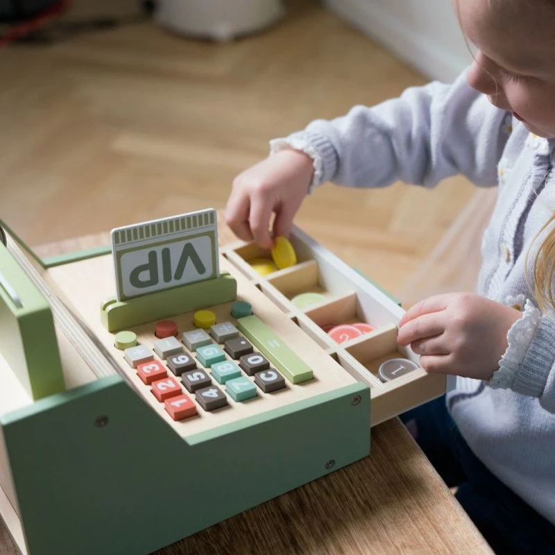 - drevená pokladňa, ideálna pre rolu predavača a zákazníka