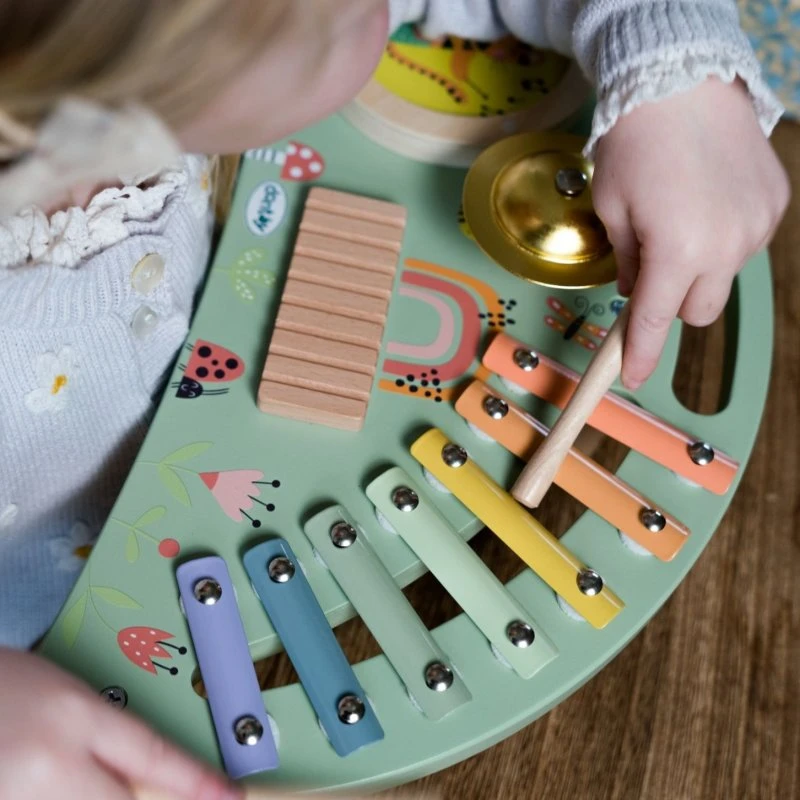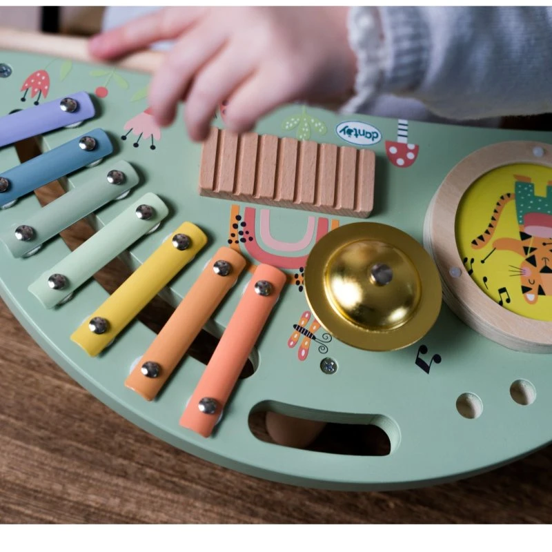 Drevený stolček pre malých muzikantov, ktorý obsahuje rôzne hudobné nástroje – xylofón, zvonček a ďalšie interaktívne prvky.