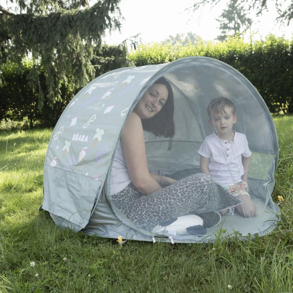 Prenosný univerzálny stan s UV faktorom 50+ na ochranu dieťaťa pred slnkom na záhrade, na pláži či na výletoch do prírody. Stan umožňuje ľahkú ventiláciu vďaka bočným otvorom so sieťovinou a textilnými chlopňami, ktoré je možné zrolovať. Sieťovina chráni dieťa v stane pred ťažkým hmyzom.