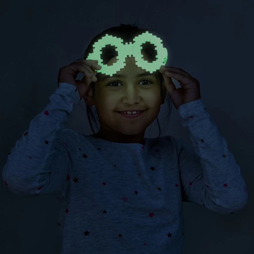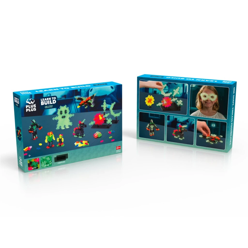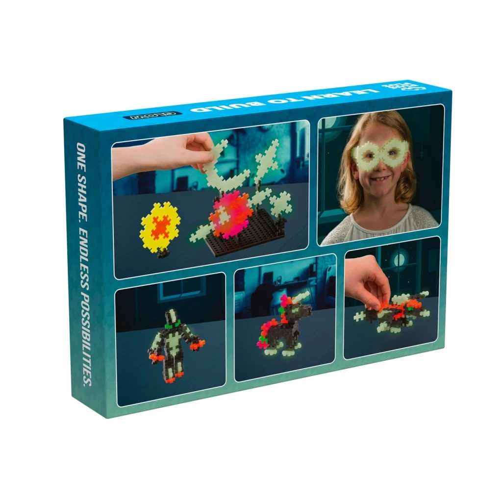 Kreatívna sada PLUS-PLUS Nauč sa stavať Svietiace v tme obsahuje celkom 500 dielikov, z toho 140 svietiacich v tme, z ktorých môžete podľa návodu postaviť rôzne strašidelné postavy a duchmi v rôznych dizajnoch a farbách.