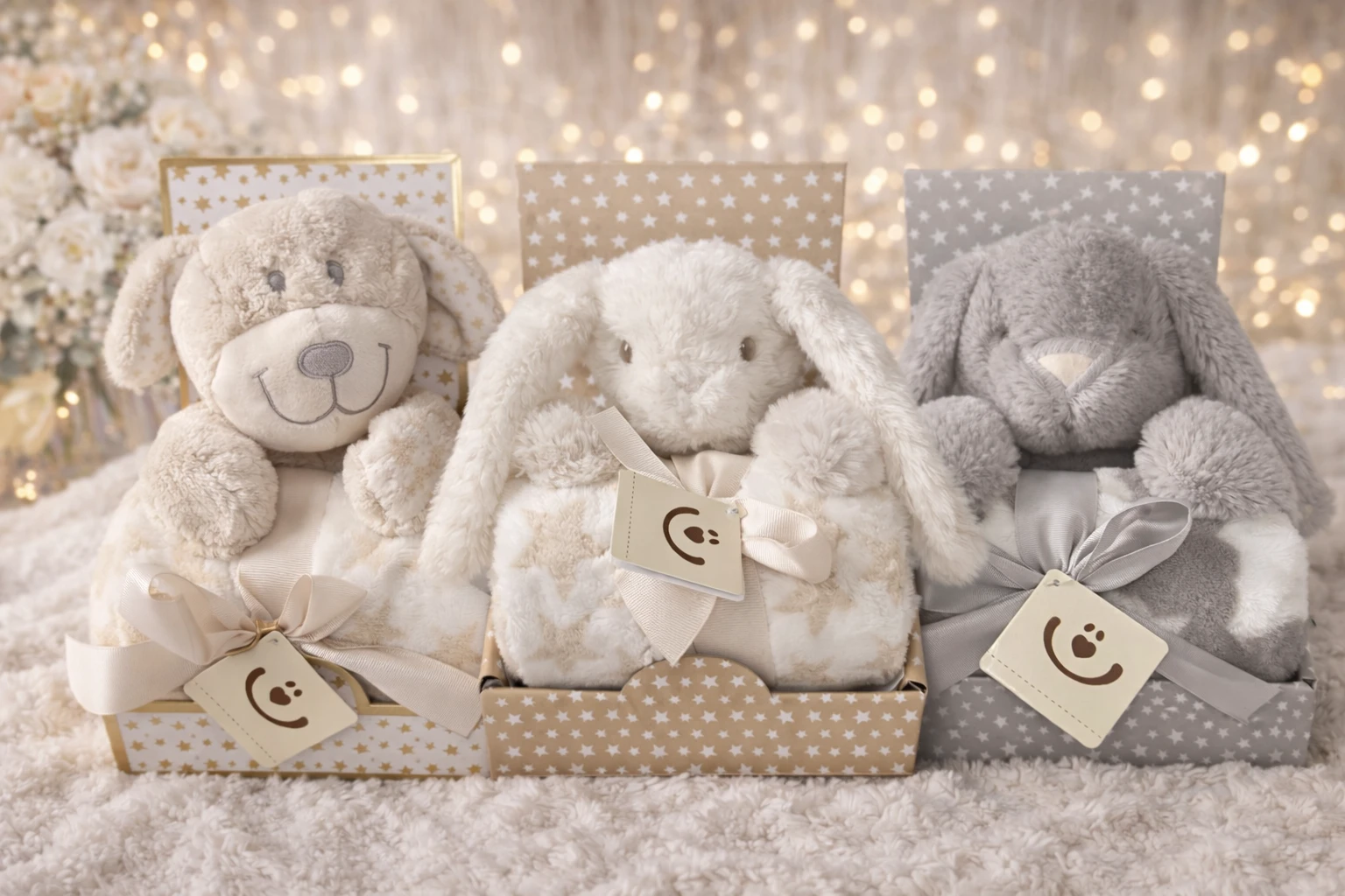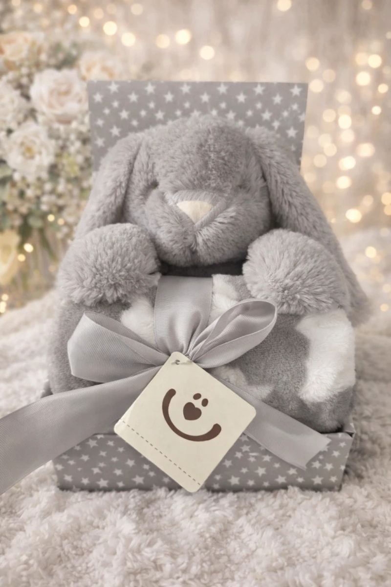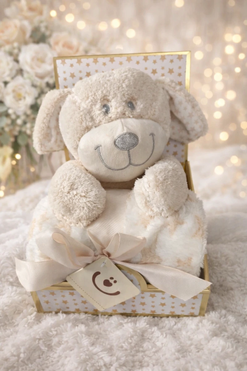 Hebučká plyšová hračka o veľkosti 25 cm v krásnej darčekovej sade s mäkkou detskou dekou o rozmere 75 × 100 cm. Ideálne ako prvý maznáčik, do postieľky, kočíka alebo ako milý darček k narodeniu bábätka.
