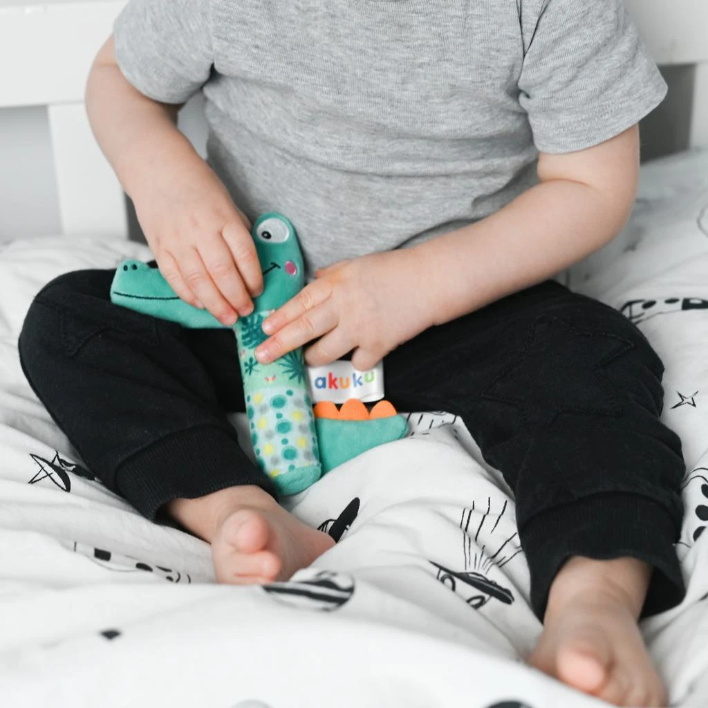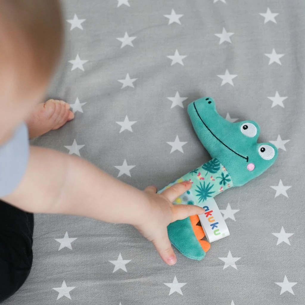 Mäkký plyšový krokodíl je vyrobený z príjemného materiálu s rôznymi textúrami, ktoré podporujú zmyslový rozvoj dieťaťa. Vďaka interaktívnym prvkom, ako je hrkálka, pískatko či šuštiace časti, dieťa baví a zároveň rozvíja jeho zrakovú, sluchovú aj pohybovú koordináciu. Pri stlačení vydáva zvuk a ukrýva drobné prekvapenia, ktoré udržia pozornosť bábätka na dlhú dobu.