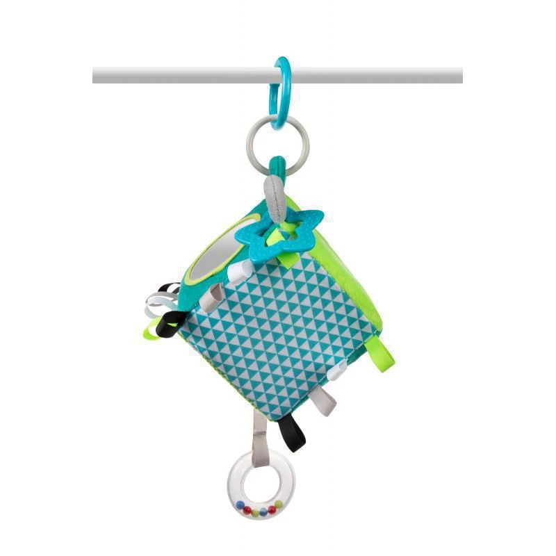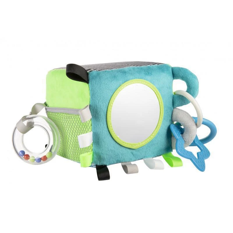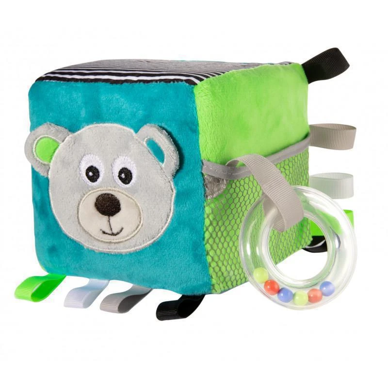 Plyšová senzorická kocka z kolekcie Mackovia. Rôzne textúry materiálov stimulujú hmat dieťaťa. Zvoniace a šuštiace prvky budia u dieťaťa pozornosť. Farebné stuhy povzbudzujú dieťa hračku uchopiť. Pružné hryzátko upokojuje dieťaťu svrbenie ďasien.