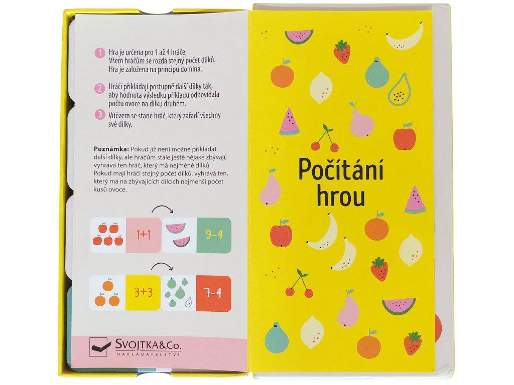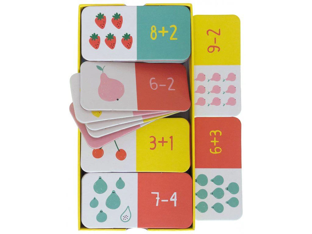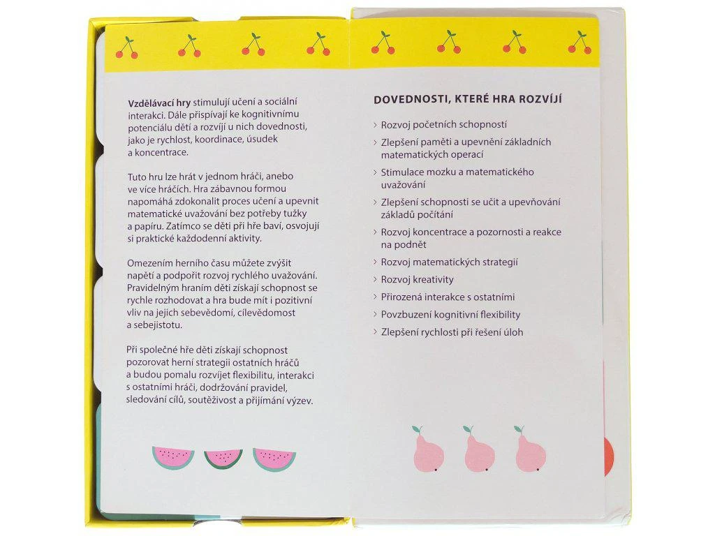 Táto hra s počtami je založená na princípe obľúbeného domina. Deti postupne prikladajú dieliky so správnymi výpočtami k dielikom so zodpovedajúcim počtom kusov ovocia. Táto vzdelávacia hra stimuluje a rozvíja u detí zručnosti, ako je rýchlosť, koordinácia, úsudok a koncentrácia. Hru je možné hrať samostatne, ale aj s viacerými hráčmi a nemusíte mať po ruke ceruzku ani papier! Hra prispieva k upevňovaniu matematického uvažovania a zlepšuje rýchlosť pri riešení úloh aj reakcií na podnety.