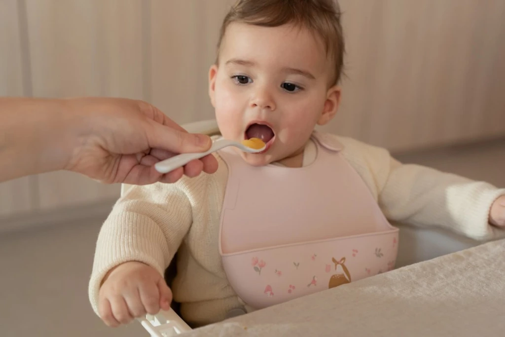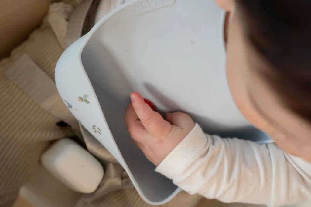 Podbradník z jemného, pružného silikónu s krásnou potlačou je vybavený širokým vreckom na zachytenie omrviniek i kvapiek.