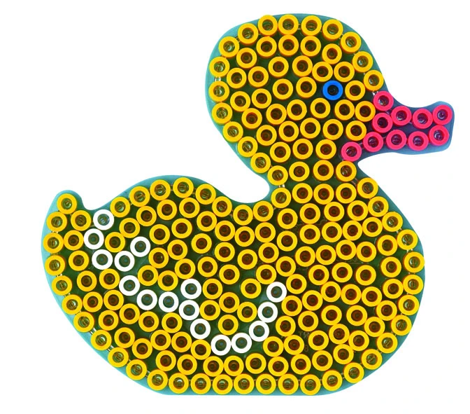 Priehľadná podložka HAMA v tvare kačice je určená pre zažehľovacie korálky MAXI (priemer 10 mm) a vďaka väčšej veľkosti je ideálna aj pre menšie deti od 3 rokov. Ponúka 209 hrotov a rozmery 17,5 × 19,5 × 1 cm, čo umožňuje tvoriť väčšie a detailnejšie motívy.