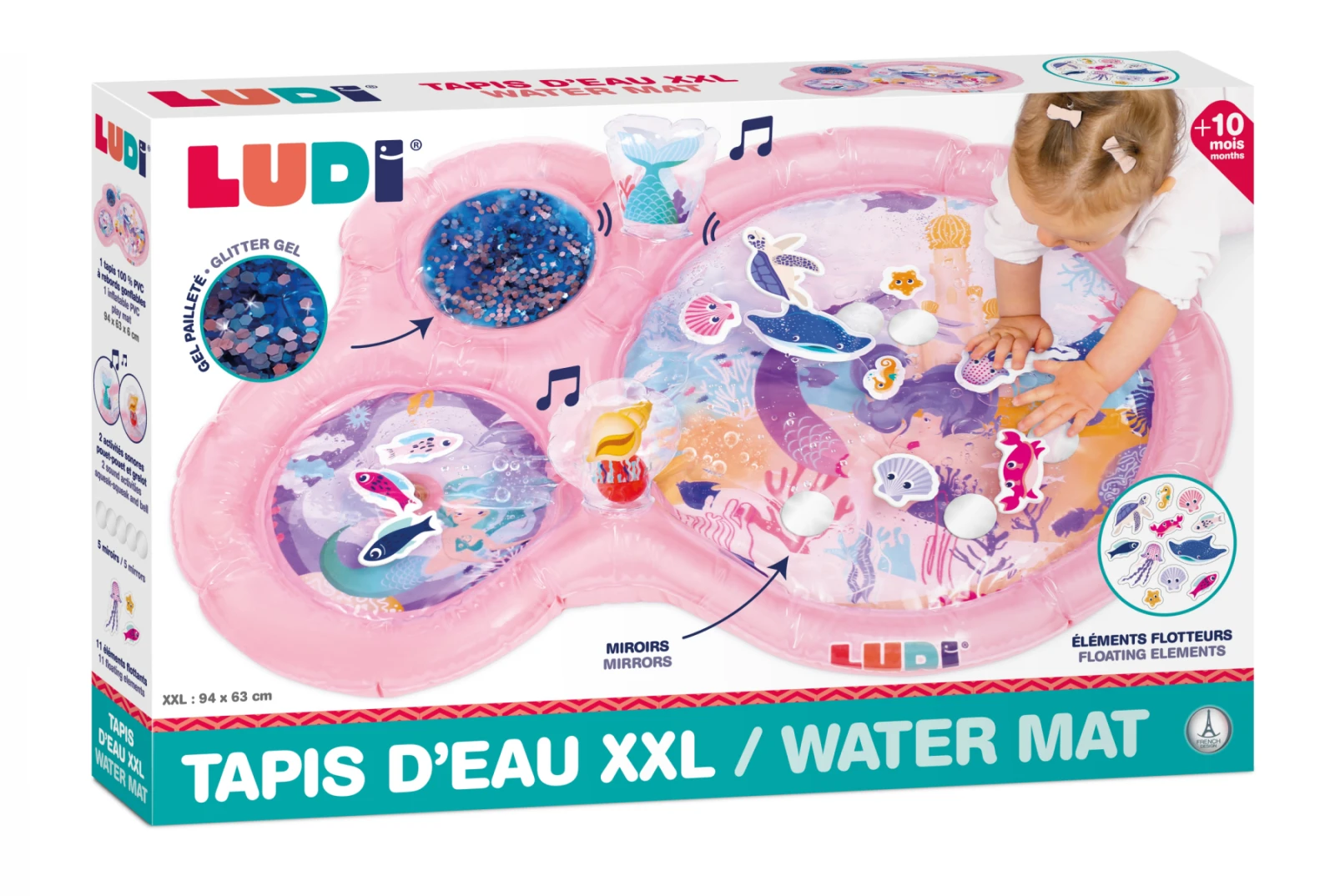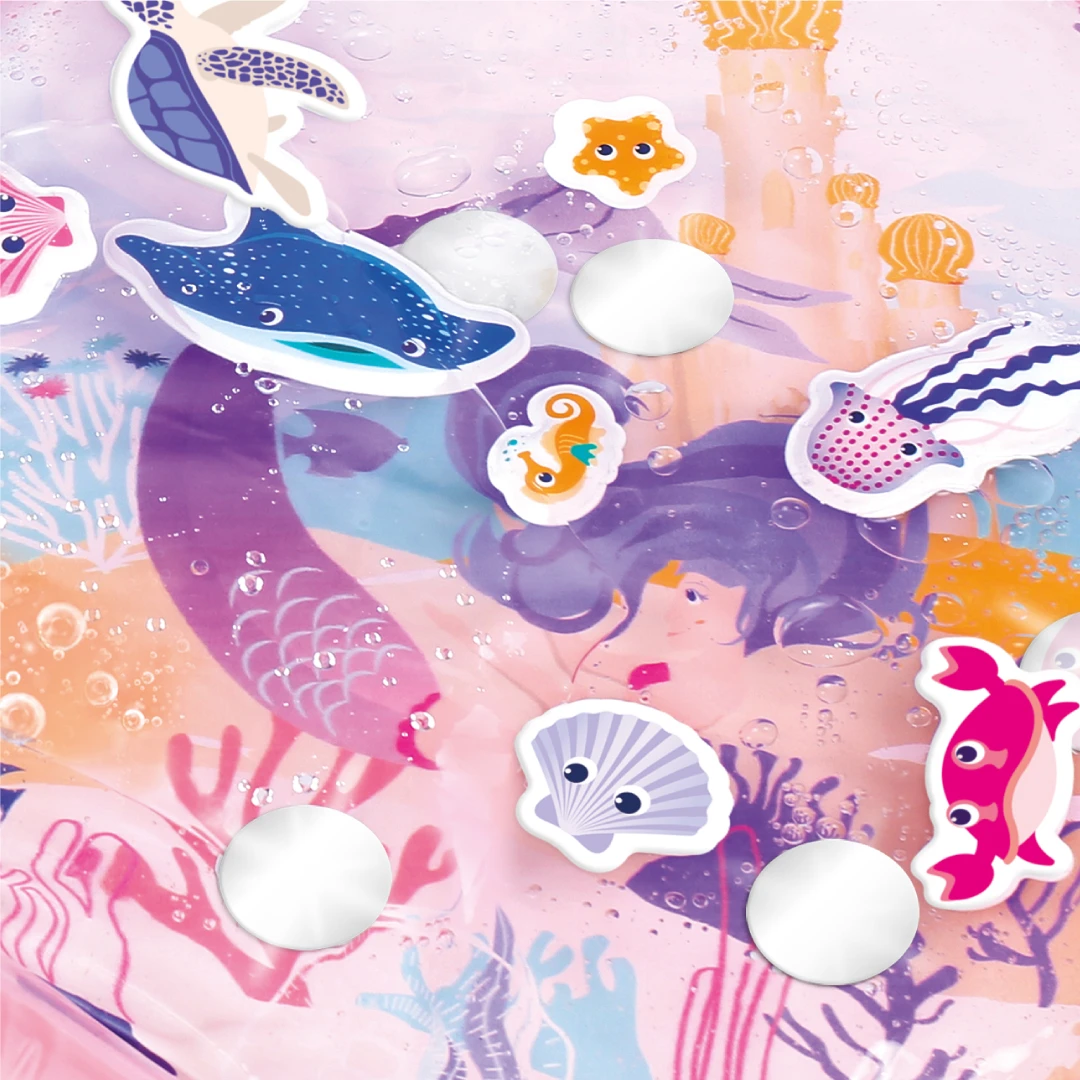 Interaktívna podložka na hranie naplnená vodou pripomína skutočný podmorský svet s vodnými živočíchmi. Figúrky morských tvorov sa vo vnútri vo vode začnú pohybovať, kedykoľvek dieťa na podložku siahne rukou. Jednotlivé časti podložky sú prepojené, takže keď sa dieťa o podložku oprie, voda prúdi medzi jednotlivými časťami. Na nafukovacích okrajoch sú umiestnené dve nafukovacie madlá, ktoré pri stlačení pískajú a cinkajú. Podložka je ideálna pre hru na brušku, ktorá je dôležitá pre správny vývoj dieťaťa. Hranie na podložke pôsobí na všetky detské zmysly, učí dieťa príčine a následku a pomáha rozvíjať jeho motorické schopnosti. Použitie podložky je veľmi jednoduché, stačí ju nafúknuť a naplniť vodou. Keď hračku nepoužívate, ľahko ju opäť vyfúknete a vodu vylejete. Rozmer podložky: 94 x 20 x 63 cmVhodné pre deti od 10 mesiacov.