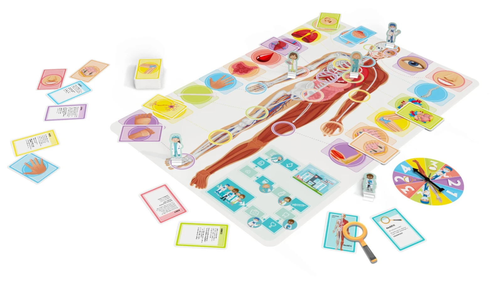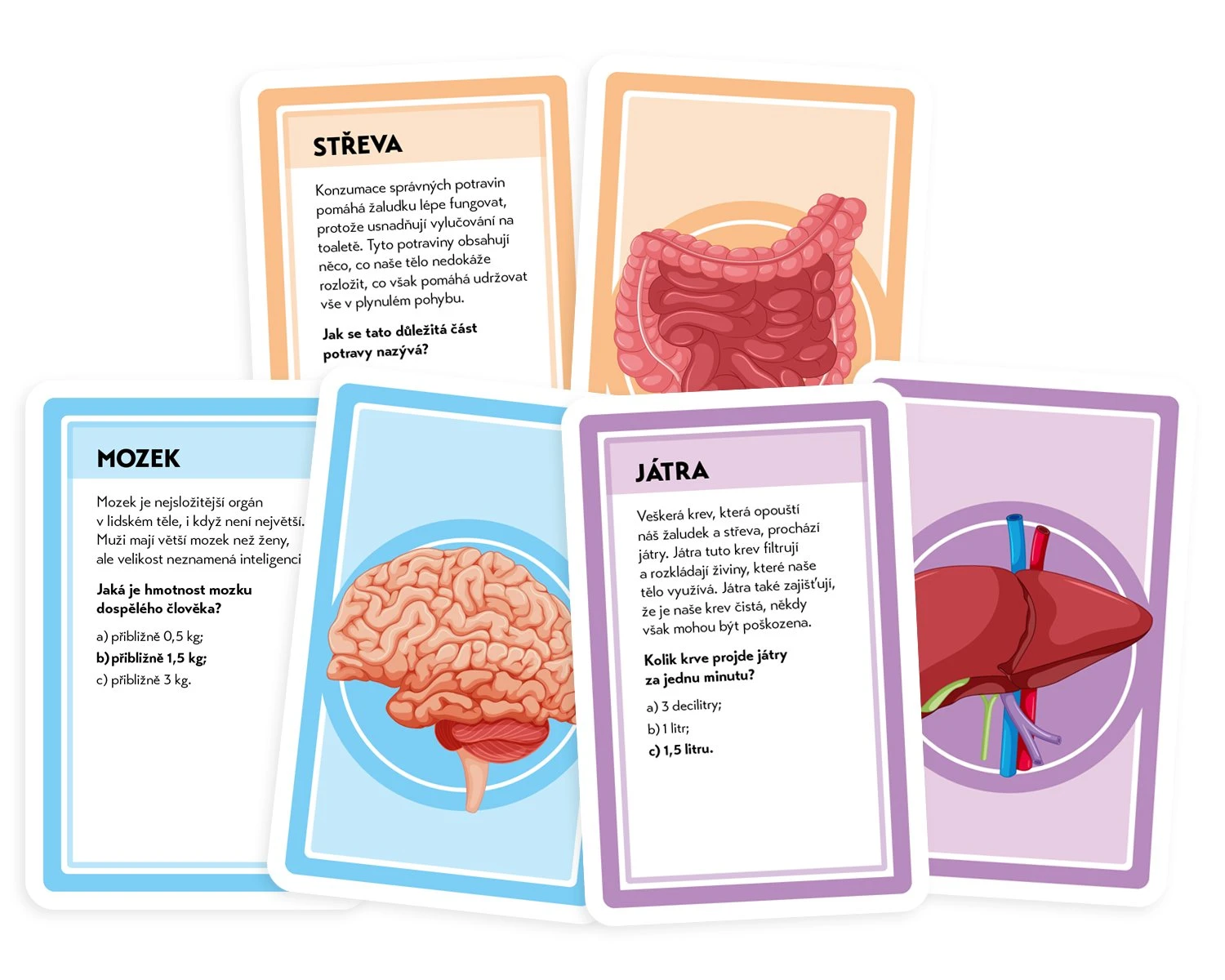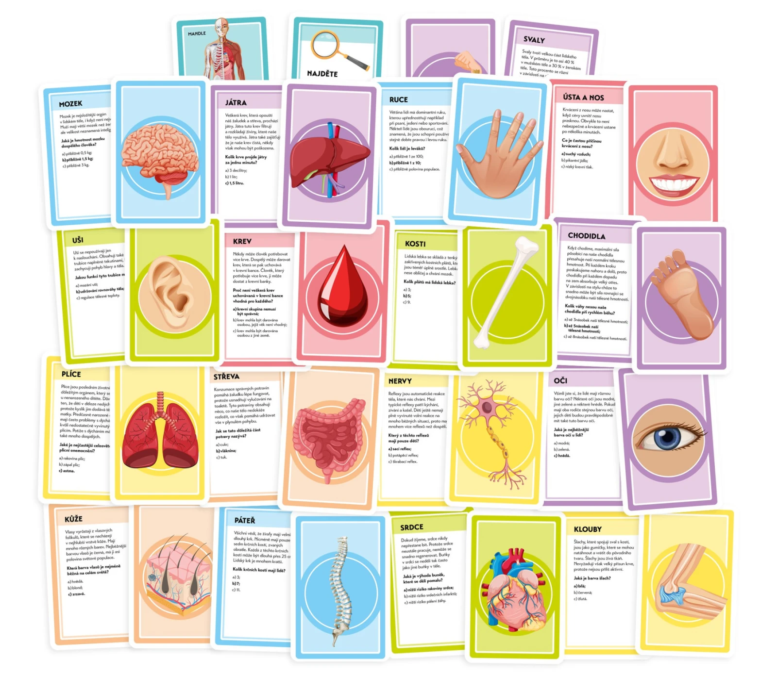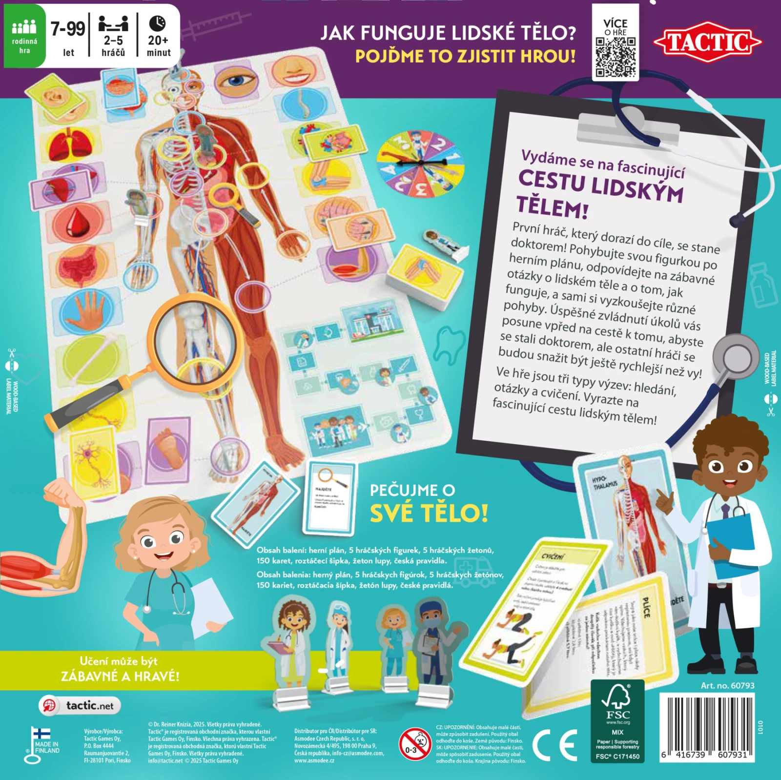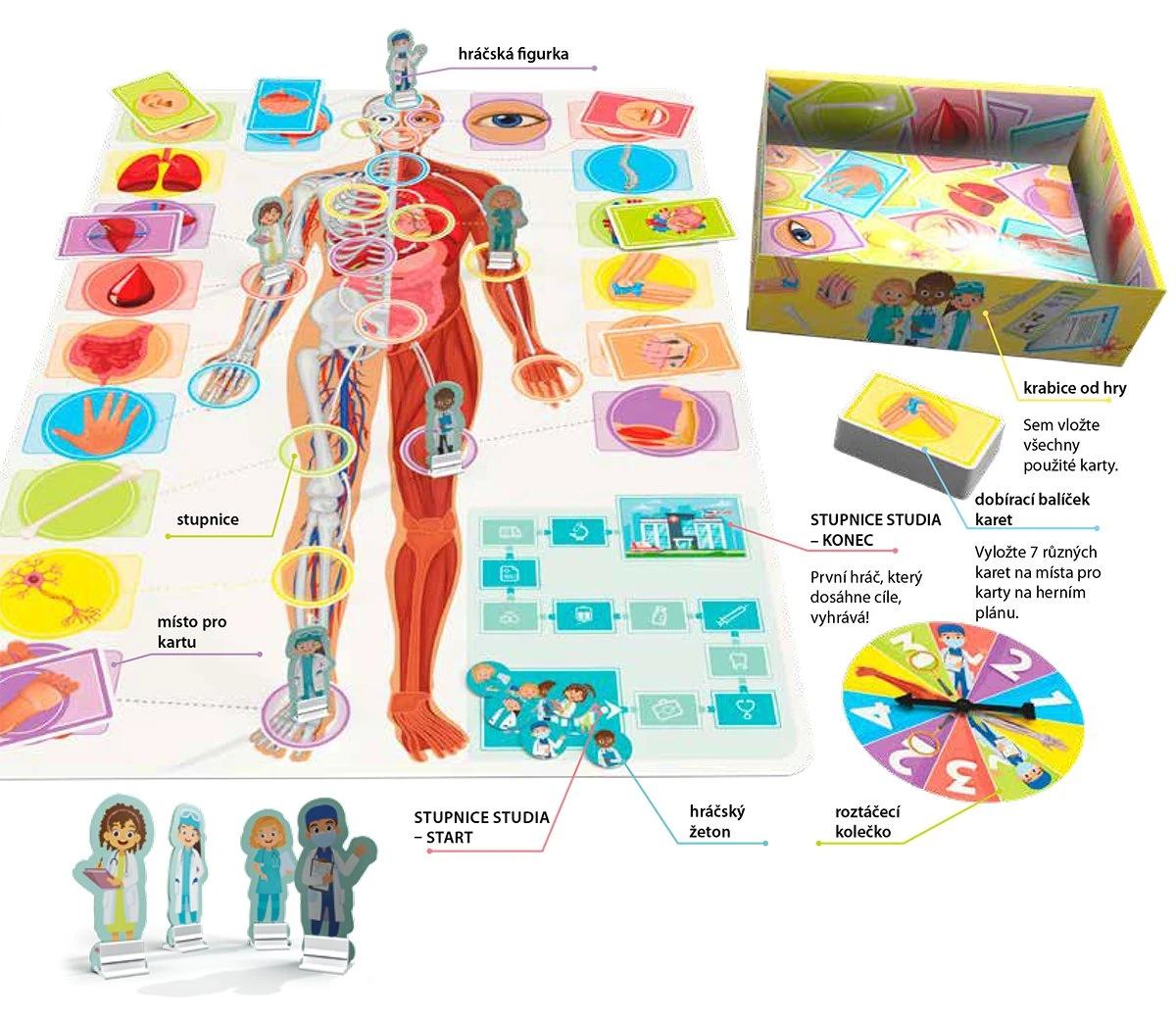 Vyrazte na fascinujúcu cestu ľudským telom! Učenie môže byť ZÁBAVNÉ A HRAVÉ! Obsah balenia: 1 herný plán 5 hráčskych figúrok 5 hráčskych žetónov 150 kariet 1 roztáčacia šípka 1 žetón lupiny slovenské pravidlá