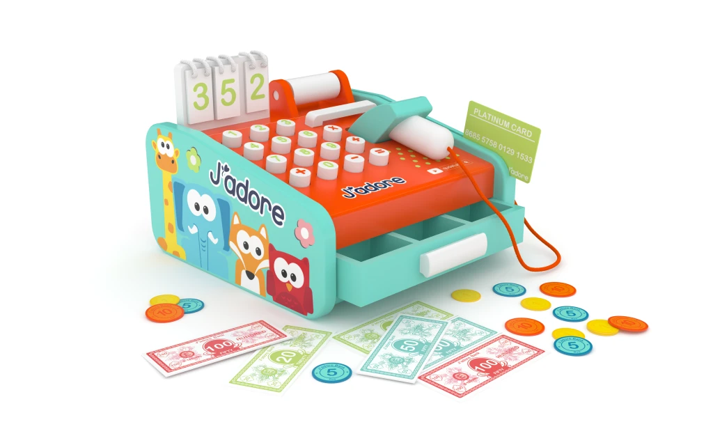 Podporuje rozvoj jemnej motoriky a počítanie Obsahuje tlačidlá, zásuvku na peniaze a príslušenstvo Vyrobené z ekologického a bezpečného dreva.