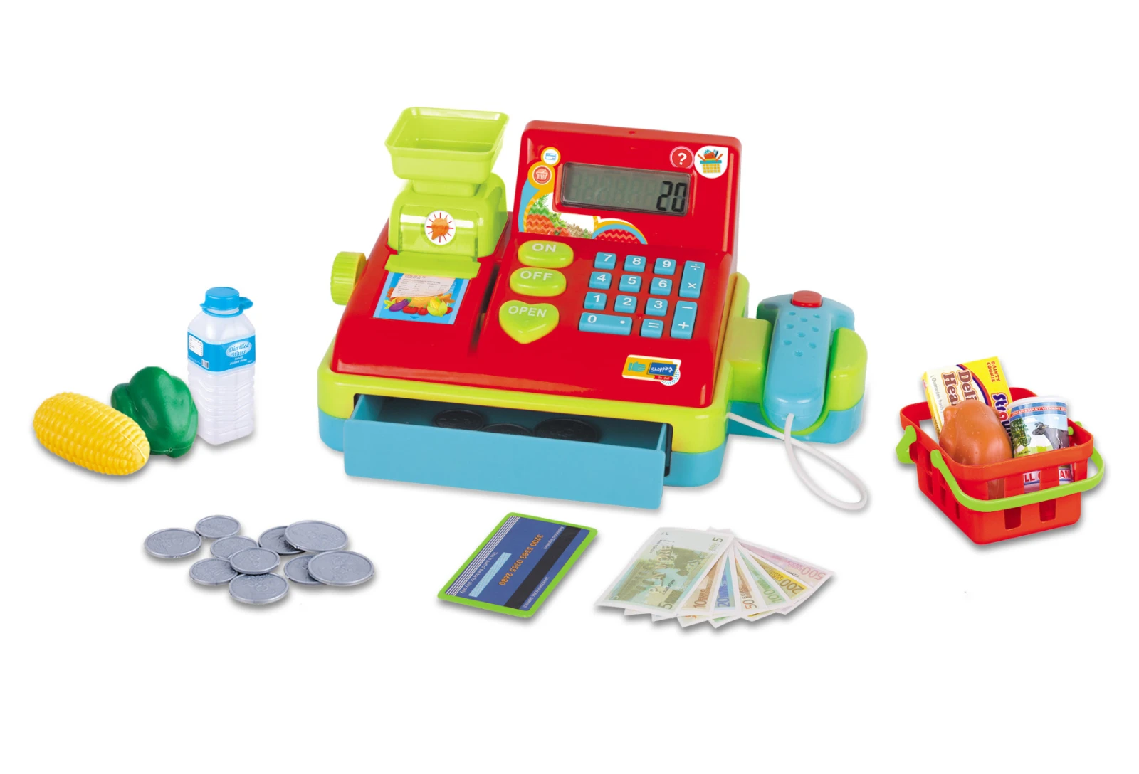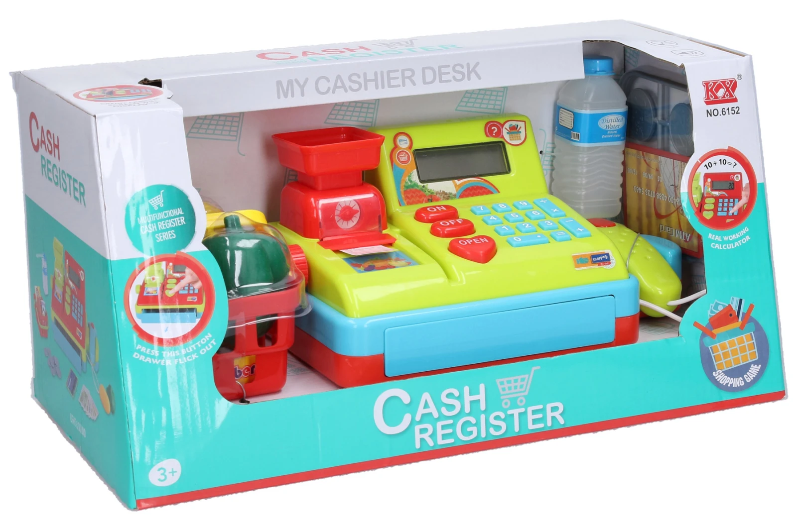 Pokladňa funguje ako kalkulačka. Obsahuje pokladňu s váhou, vychádzacou papierovou účtenkou, vysúvacím šuplíkom, peniaze a košík s nákupom. Svetelné a zvukové efekty. Pri použití karty sa pokladnica vynuluje. Batéria 2xAA súčasťou.
