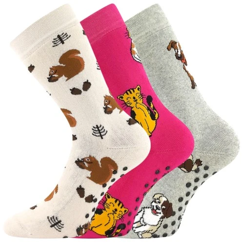 Detské veselé ponožky Boma® s protišmykovými bodkami majú zosilnené froté chodidlo tlmiace nárazy, nohy tak majú milé deti ako v bavlnke.