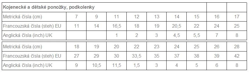 | Veľkosti ponožiek | 20 - 22 (6 - 18 mesiacov) / 23 - 25 (2 - 3 roky) / 26 - 28 / 29 - 31 / 32 - 34 / 35 - 37 |