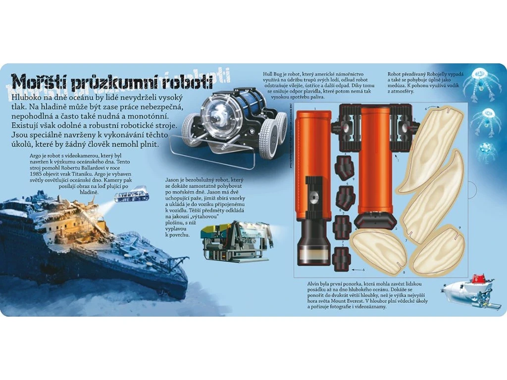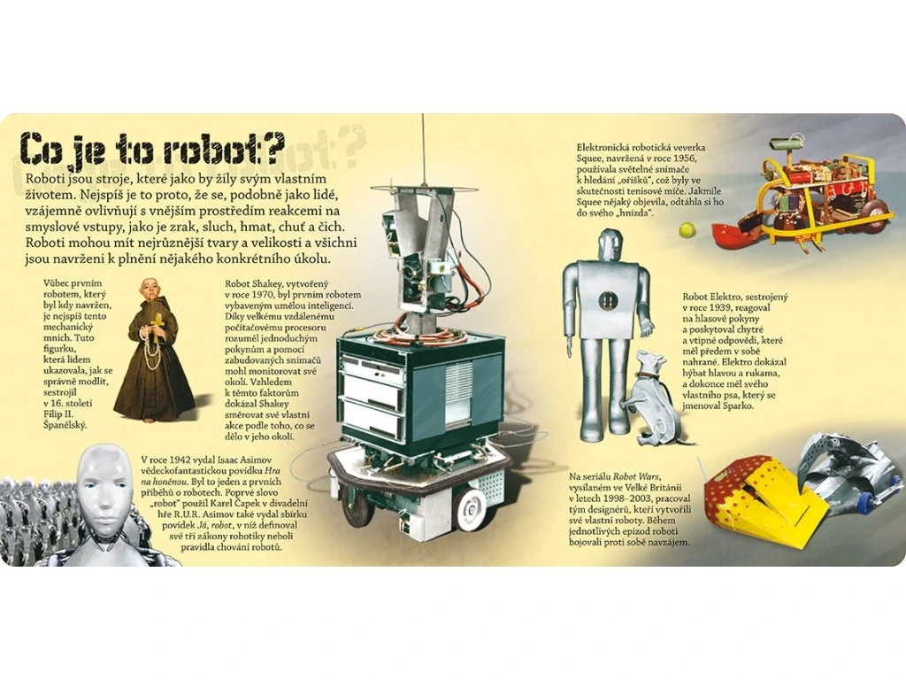 Roboti sú stroje, ktoré akoby žili svojím vlastným životom. Pomáhajú človeku pri práci v hlbokých oceánoch, vo vesmíre aj pri nesmierne zložitých operáciách. Dokážu roboti myslieť? Kedy bol vyrobený prvý robot a môžu hrať roboti divadlo? V tejto knižke nájdeš odpovede aj na tieto otázky. Ale to nie je všetko! Vnútri sa skrývajú štyri modely rôznych robotov, ktoré sa dajú jednoducho zostaviť dohromady, bez nožníc, bez lepidla. Tak ktorého zostavíš ako prvý?