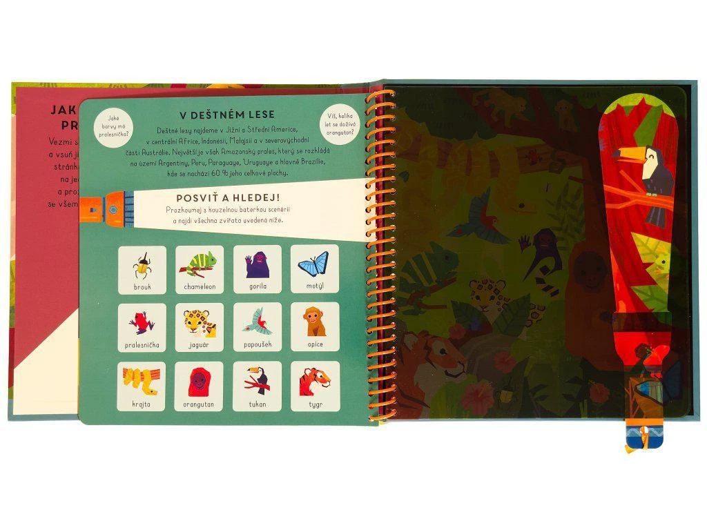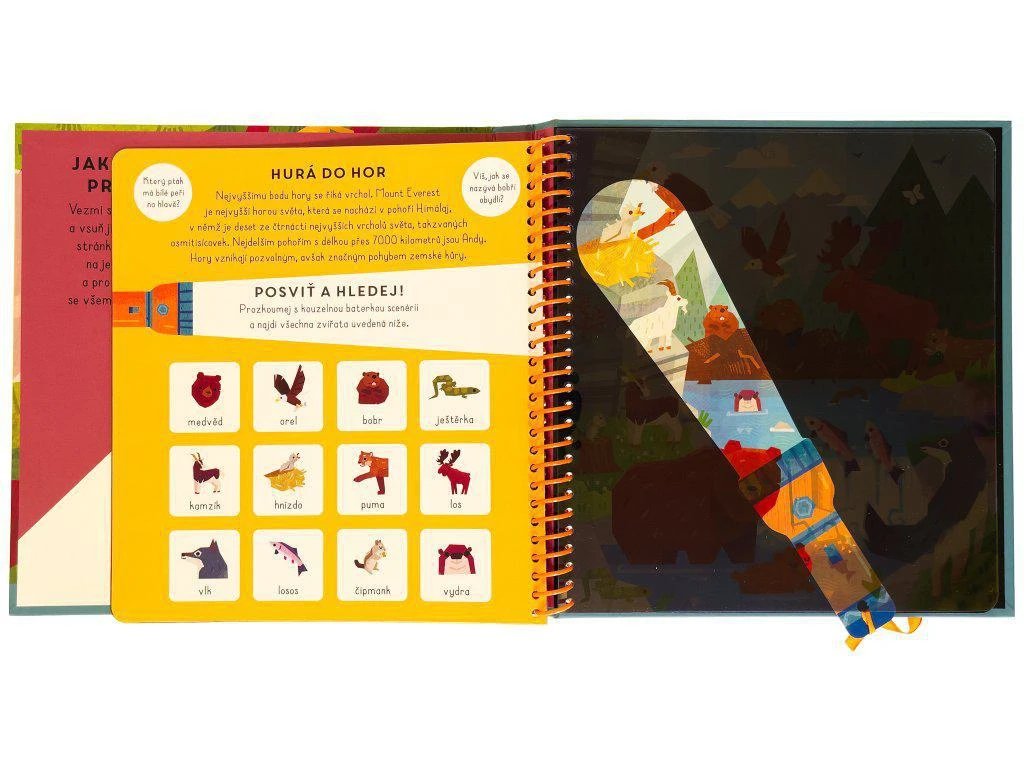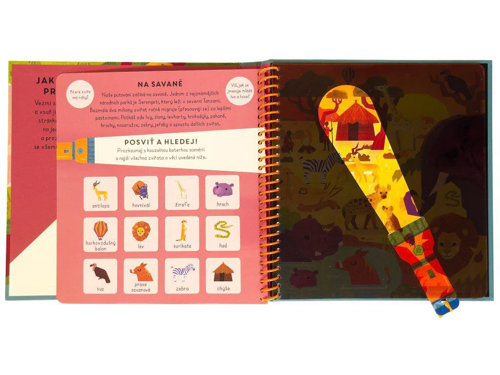 Stačí vložiť kúzelnú baterku medzi fóliu a čiernu stránku - a hneď si posvietiš na ukryté zvieratá v jednotlivých scenériách. Preskúmaj savanu, dažďový les, hory i stepi a zisti, ktoré fascinujúce zvieratá v nich žijú.