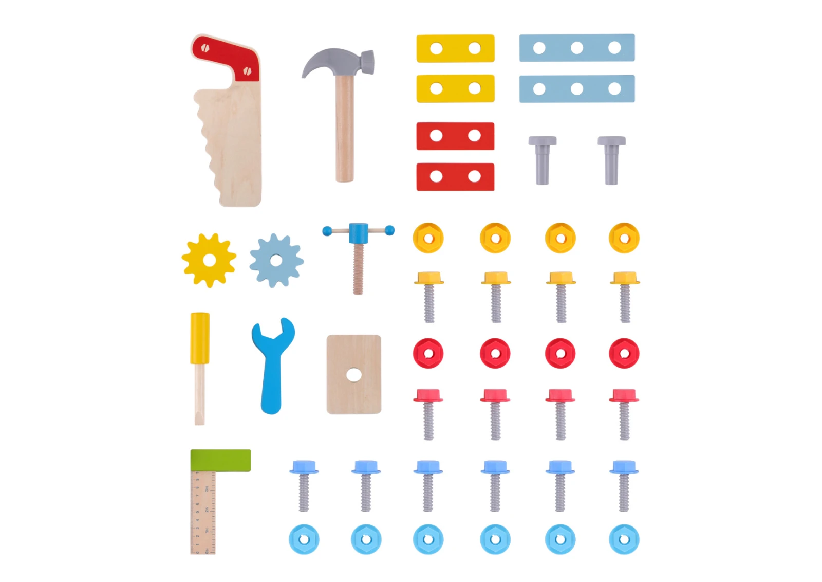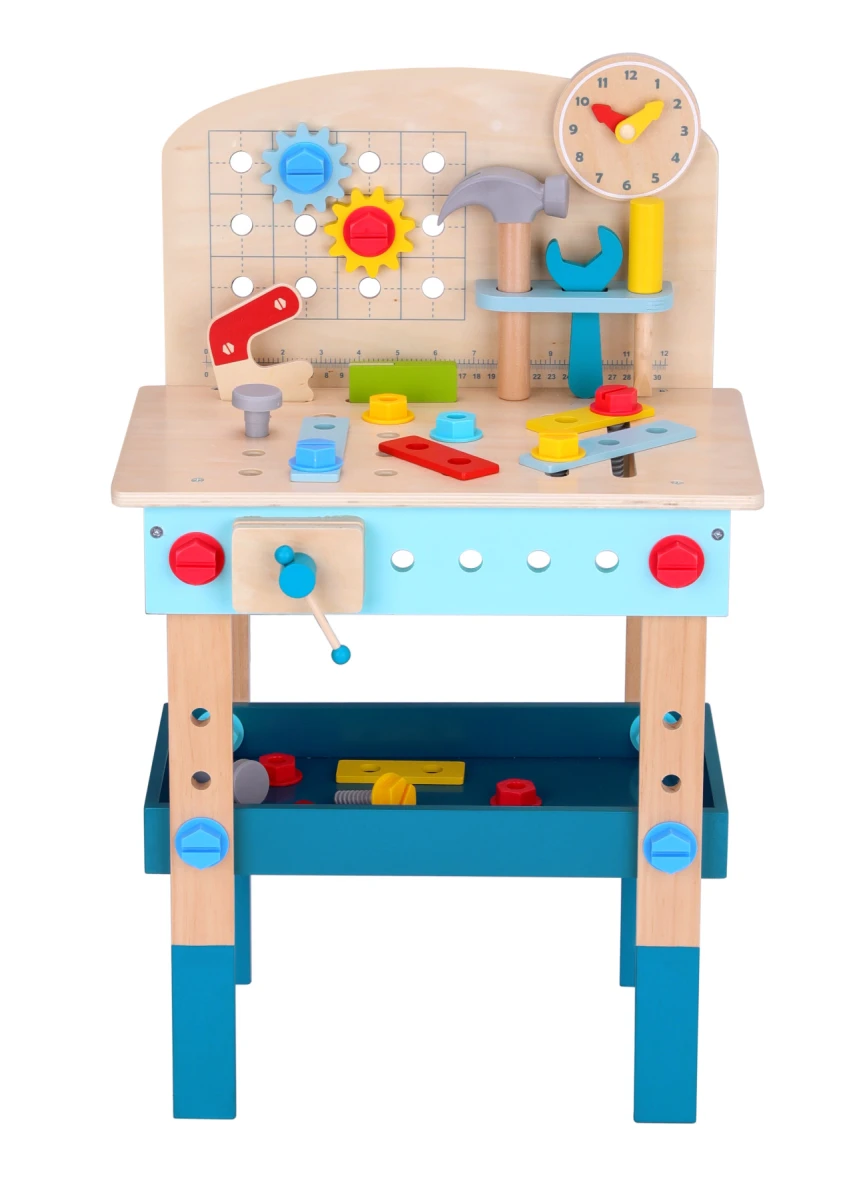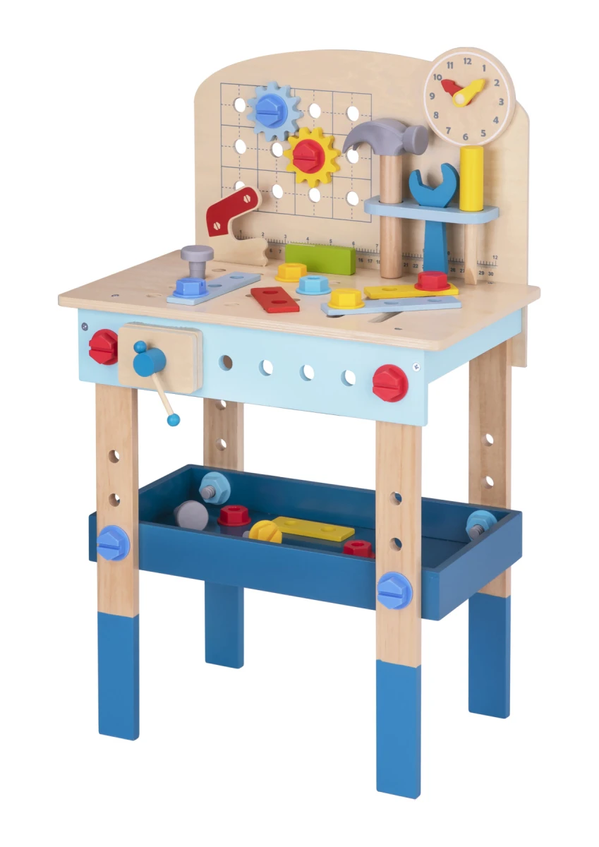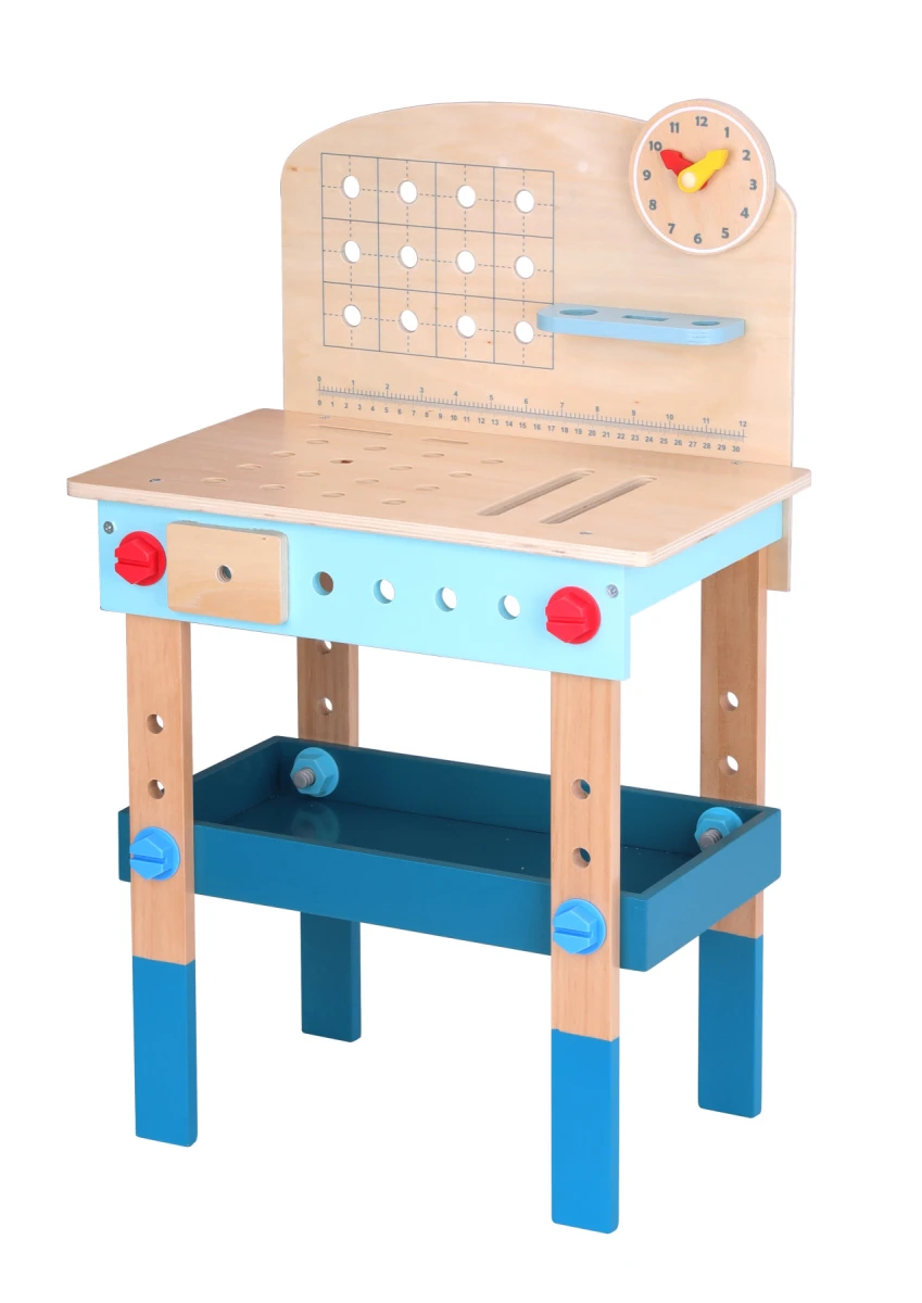 Príslušenstvo: stôl s miestami pre praktické náradie, hodiny pripevnené k stolu. Hračky: píla, kladivo, kľúč, skrutkovač, zvinovací meter, skrutky, ozubené kolesá, dosky.