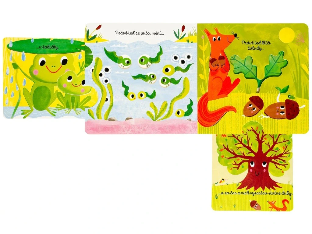 Táto kniha je krásne ilustrovaným interaktívnym leporelom pre malých čitateľov, ktoré ich zavedie do fascinujúceho sveta prírodných premien. Sledujte s vašimi najmenšími, ako sa žubrienky menia na žaby, žalude klíčia na mohutné duby a húsenice sa premieňajú na pestrofarebné motýle. Naučte deti pozerať sa na svet okolo seba a objavujte spoločne cykly prírody – od kvapiek dažďa tvoriacich rieku po semienka, z ktorých jedného dňa vyrastie jabloň či ohromná tekvica. Vďaka jednoduchým a zrozumiteľným textom kniha deťom približuje zázraky prírody, prebiehajúce každým dňom. Interaktívne vysúvacie prvky rozvíjajú detskú predstavivosť a povzbudzujú deti k hľadaniu odpovedí na otázky, zatiaľ čo očarujúce podnecujú detskú zvedavosť. Leporelo je ideálny pre spoločné chvíle s rodičmi aj prvé samostatné čítanie a objavovanie s knihou.
