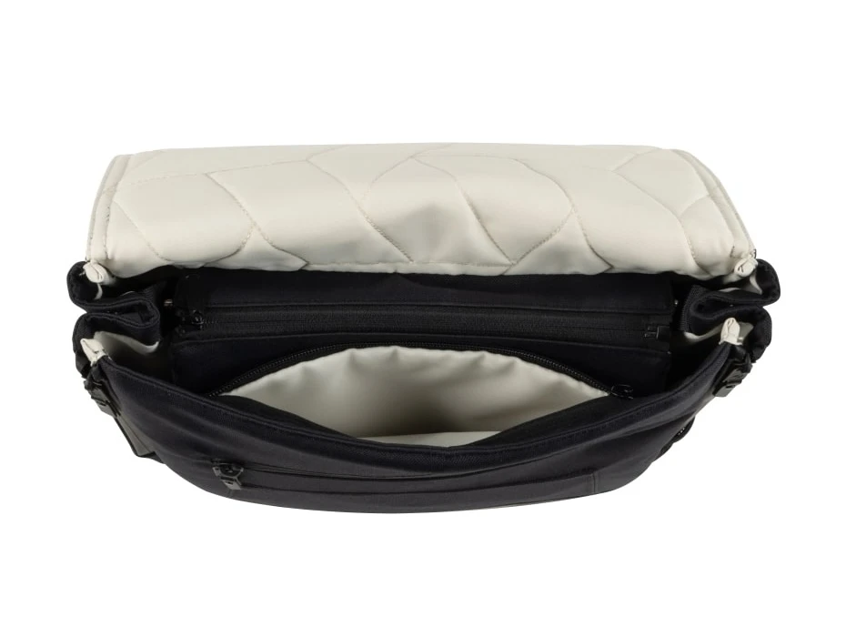 Batoh je možné zavesiť na madlo kočíka, nosiť na chrbte či v ruke aj navliecť na rukoväť kufra na kolieskach.