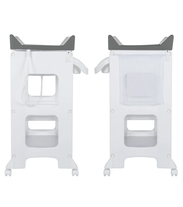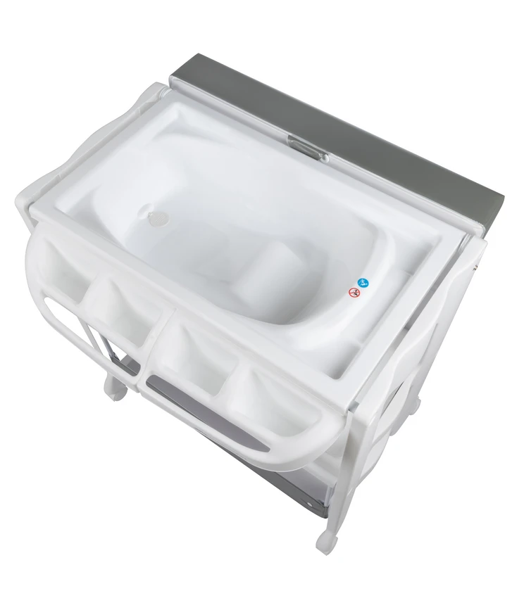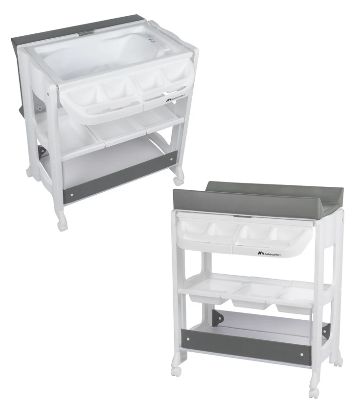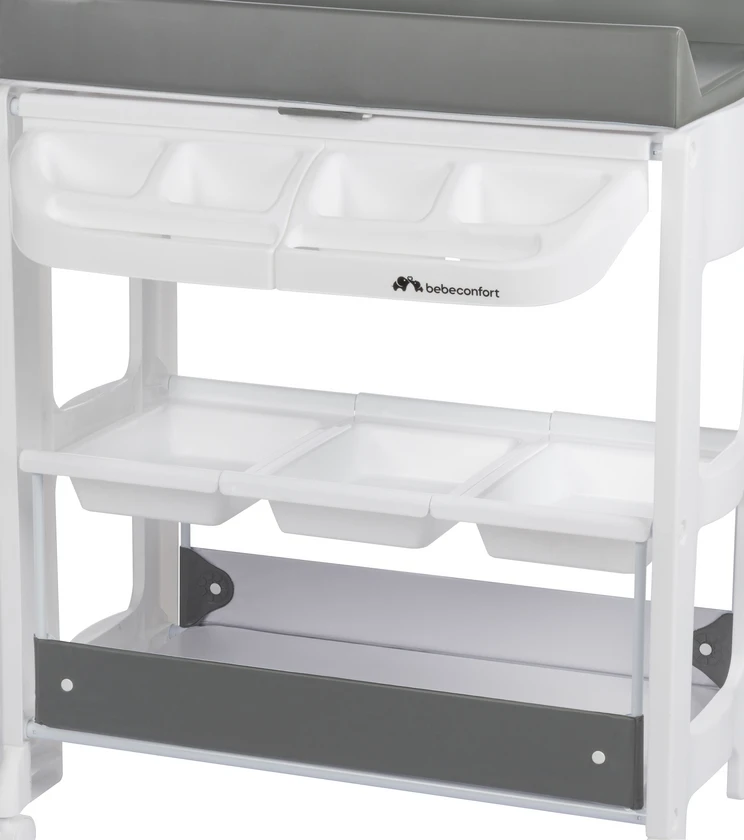Mäkký, polstrovaný a stabilný prebaľovací pultIntegrovaná ergonomická vanička s protišmykovou úpravou pre bezpečné kúpanie bábätka. 4 malé odkladacie priehradky s držiakmi na uteráky. 3 väčšie odkladacie priehradky uprostred a odkladacia plocha. Postranná sieťka na uchovávanie predmetov. Kolieska s brzdou pre ľahké premiestnenie. Výpustná hadica k vaničke.