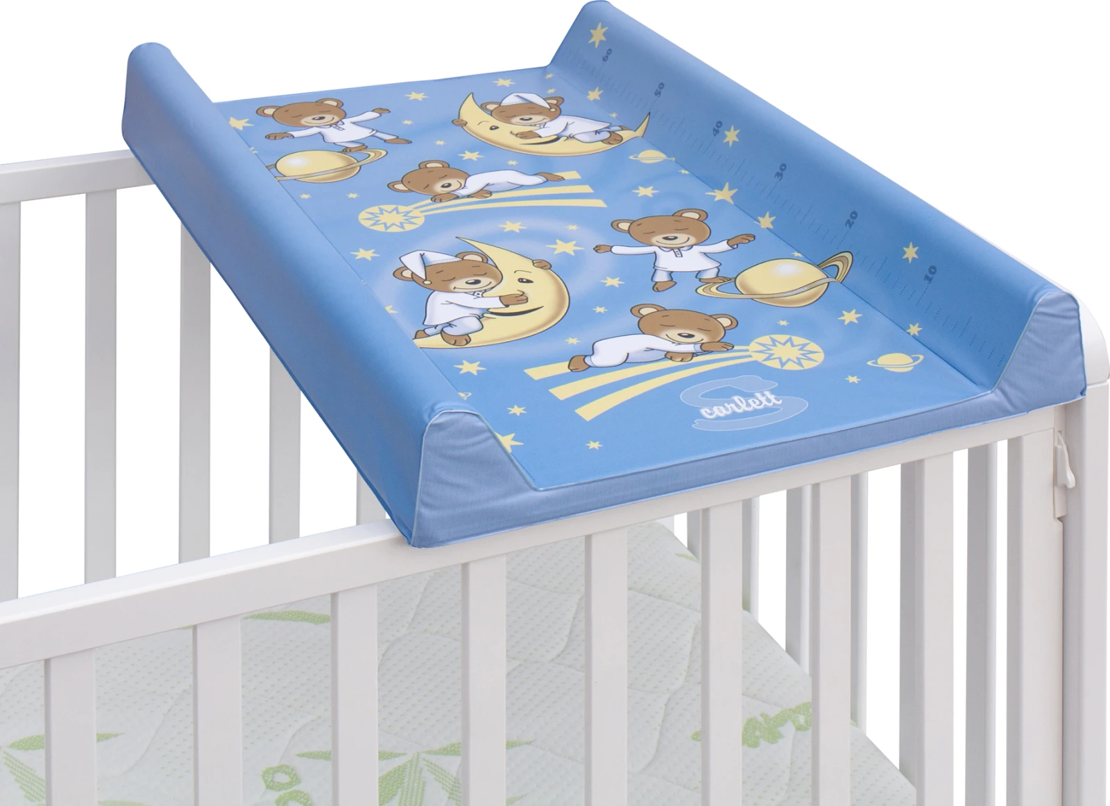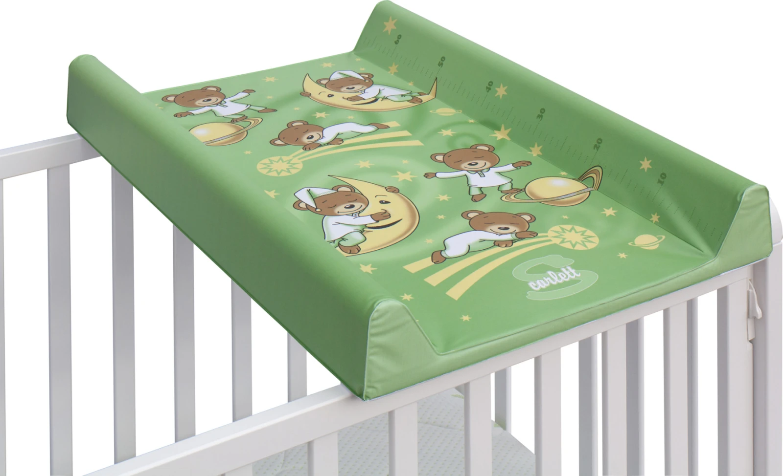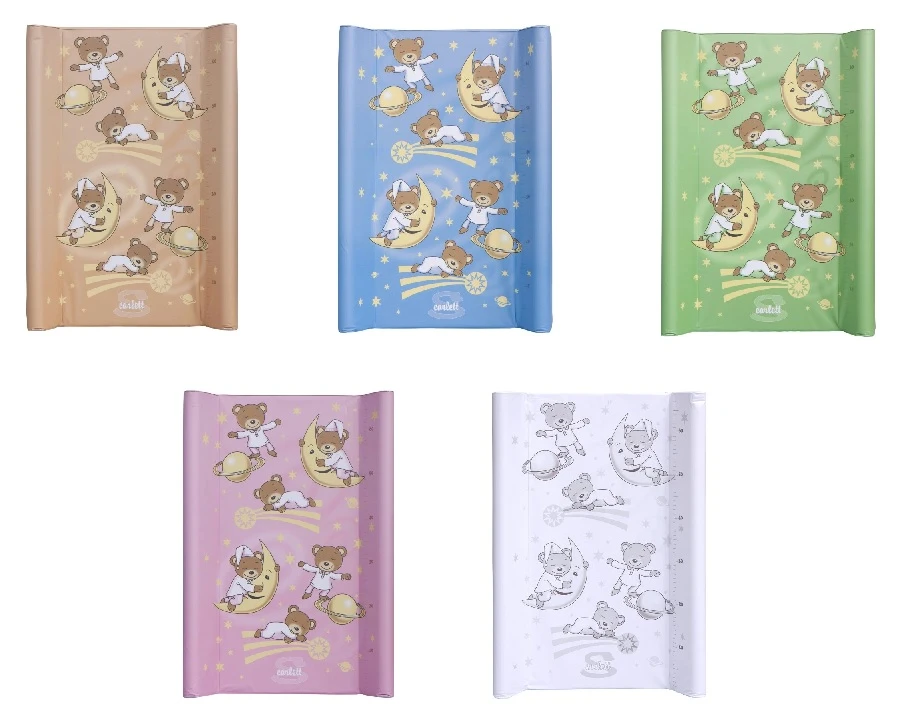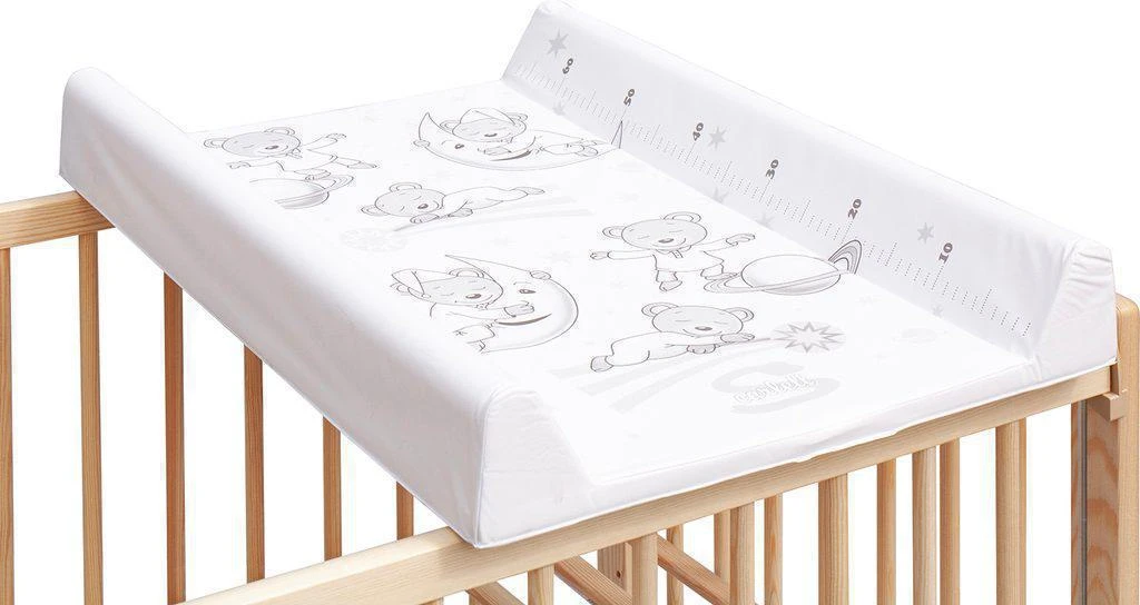Prebaľovacia podložka s pevnou vložkou z MDF a profilovanými okrajmi s kvalitným PVC poťahom bez ftalátov, vyplnená molitanom.