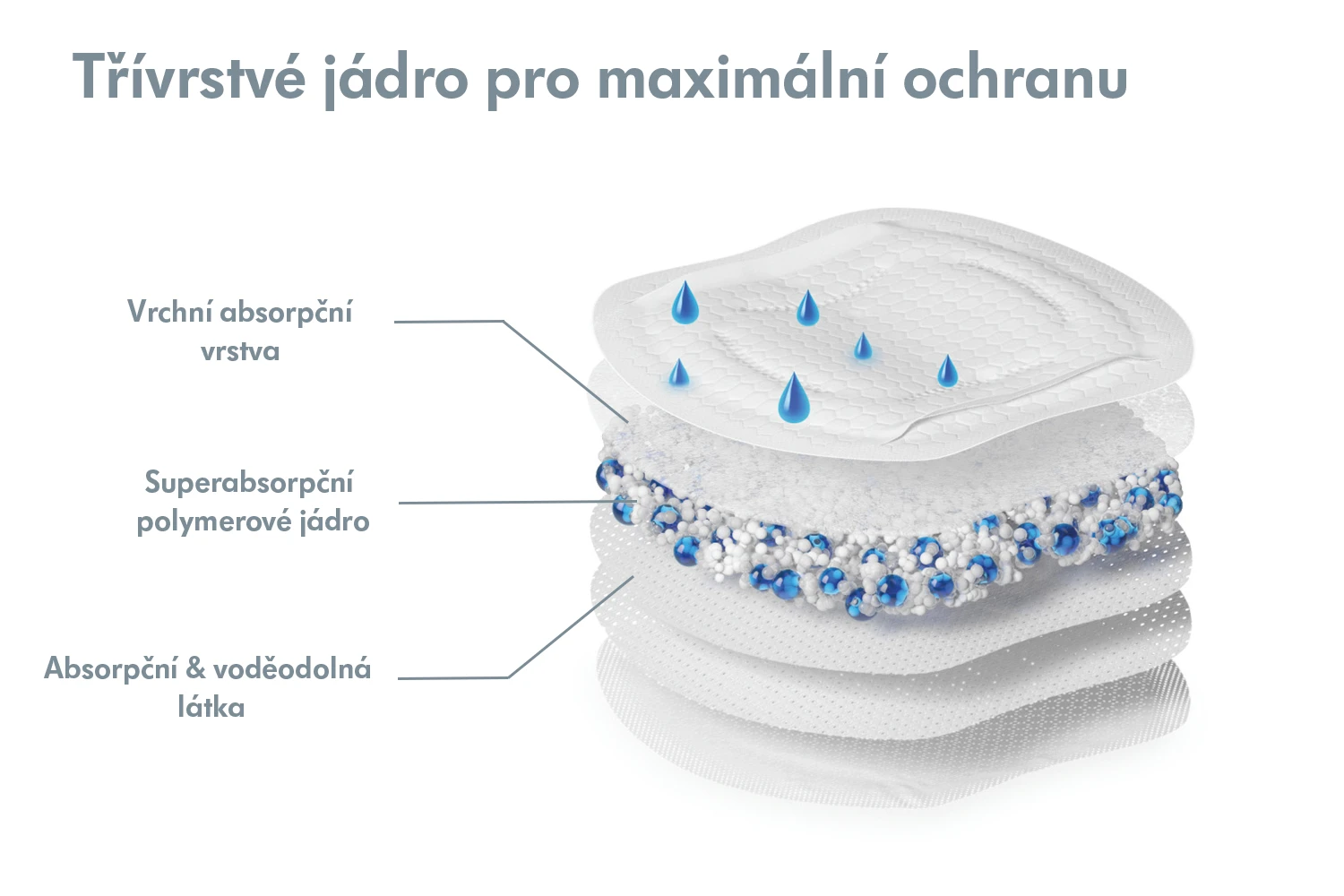 Tieto ultra priedušné prsné vložky ponúkajú maximálnu ochranu a pohodlie. Vďaka trojvrstvovému absorpčnému jadru a nepremokavej zadnej vrstve udrží vaše oblečenie v suchu. Bočná ochrana proti úniku mlieka bezpečne zachytí materské mlieko, takže sa môžete cítiť určite a komfortne po celý deň.