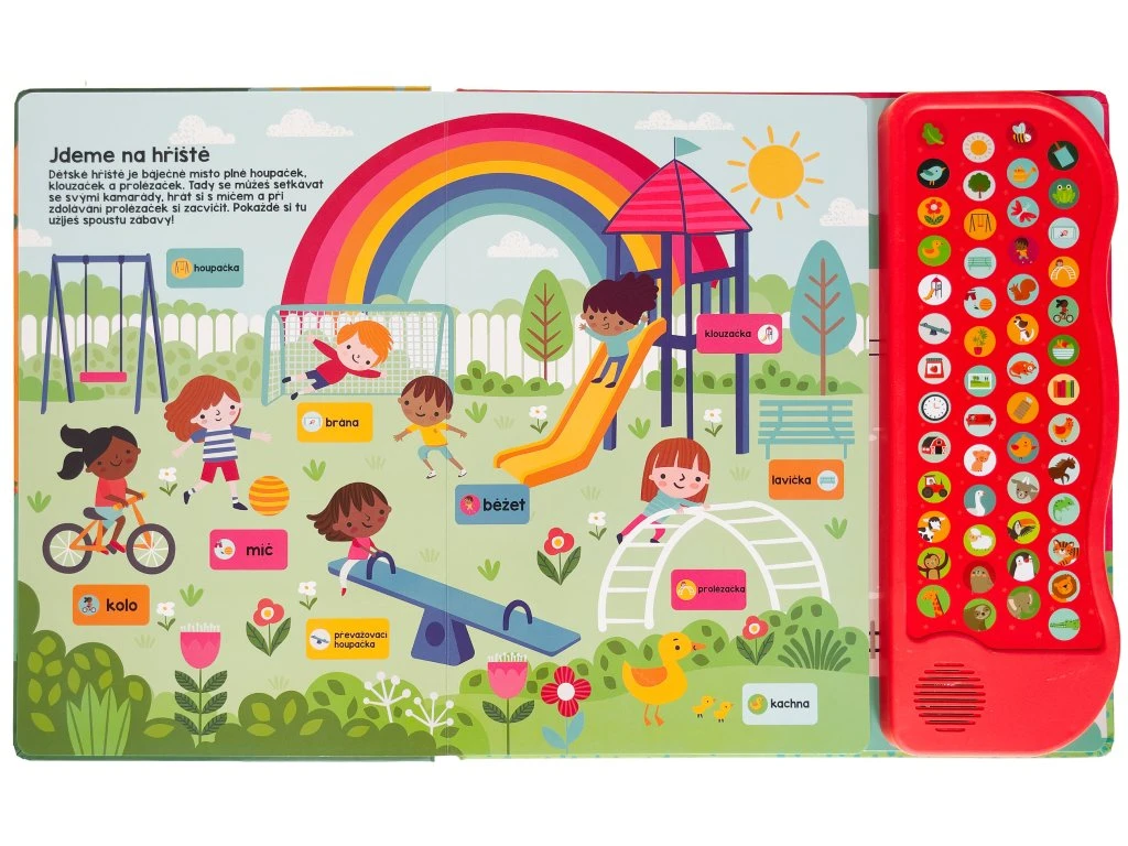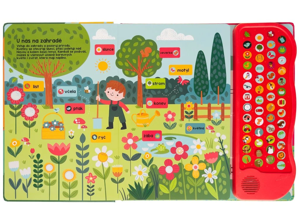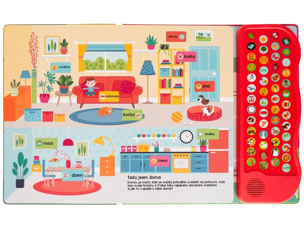 Interaktívna kniha plná roztomilých obrázkov s 52 zvukmi predstavuje ideálnu pomôcku pre malé deti, ktoré objavujú svet okolo seba a učia sa nové slová. Rozprávajte sa nad obrázkami a rozširujte slovnú zásobu svojho dieťaťa hravou formou. Či už sme doma, na záhrade, na ihrisku alebo v zoologickej záhrade, všade tam sa deje množstvo zaujímavých vecí, o ktorých sa môžeme rozprávať.