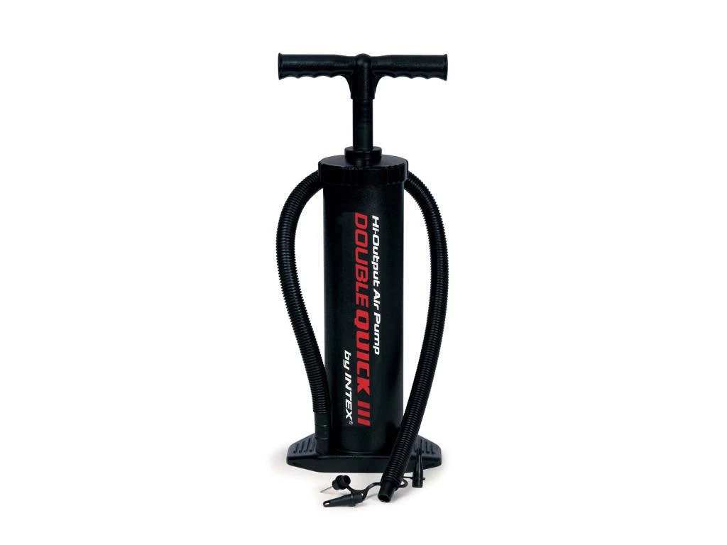 Ručná pumpa Veľkosť 48 cm. Dvojitý objem, dvojitý záber, 3 1/2 krát prietok vzduchu. Pumpuje vzduch pri ťahu nahor aj pri pohybe dole. Flexibilná hadička so 4 násadami je použiteľná pre väčšinu ventilov. Z ľahkého pevného plastu. Vysoko-objemová pumpa umožňuje nafukovanie aj vyfukovanie.